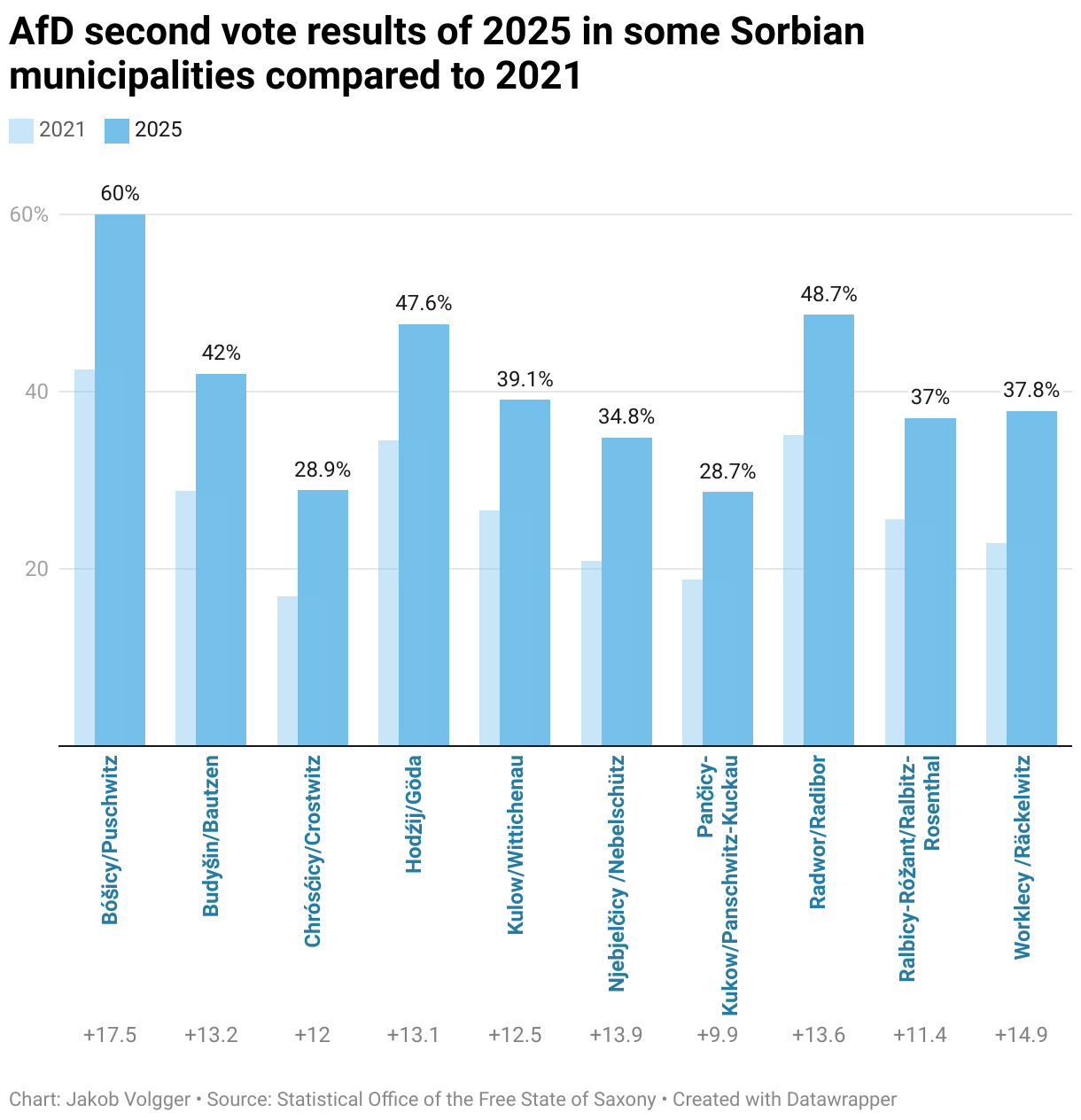 AfD second vote results of 2025 in some Sorbian municipalities compared to 2021