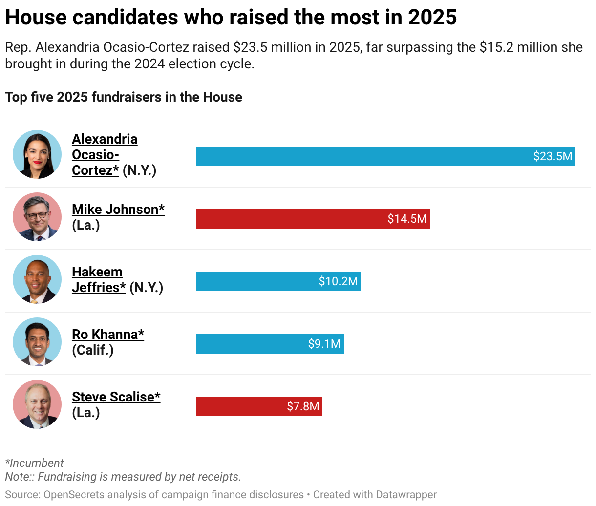 Rep. Alexandria Ocasio-Cortez raised $23.5 million in 2025, far surpassing the $15.2 million she brought in during the 2024 election cycle. Top five 2025 fundraisers in the House