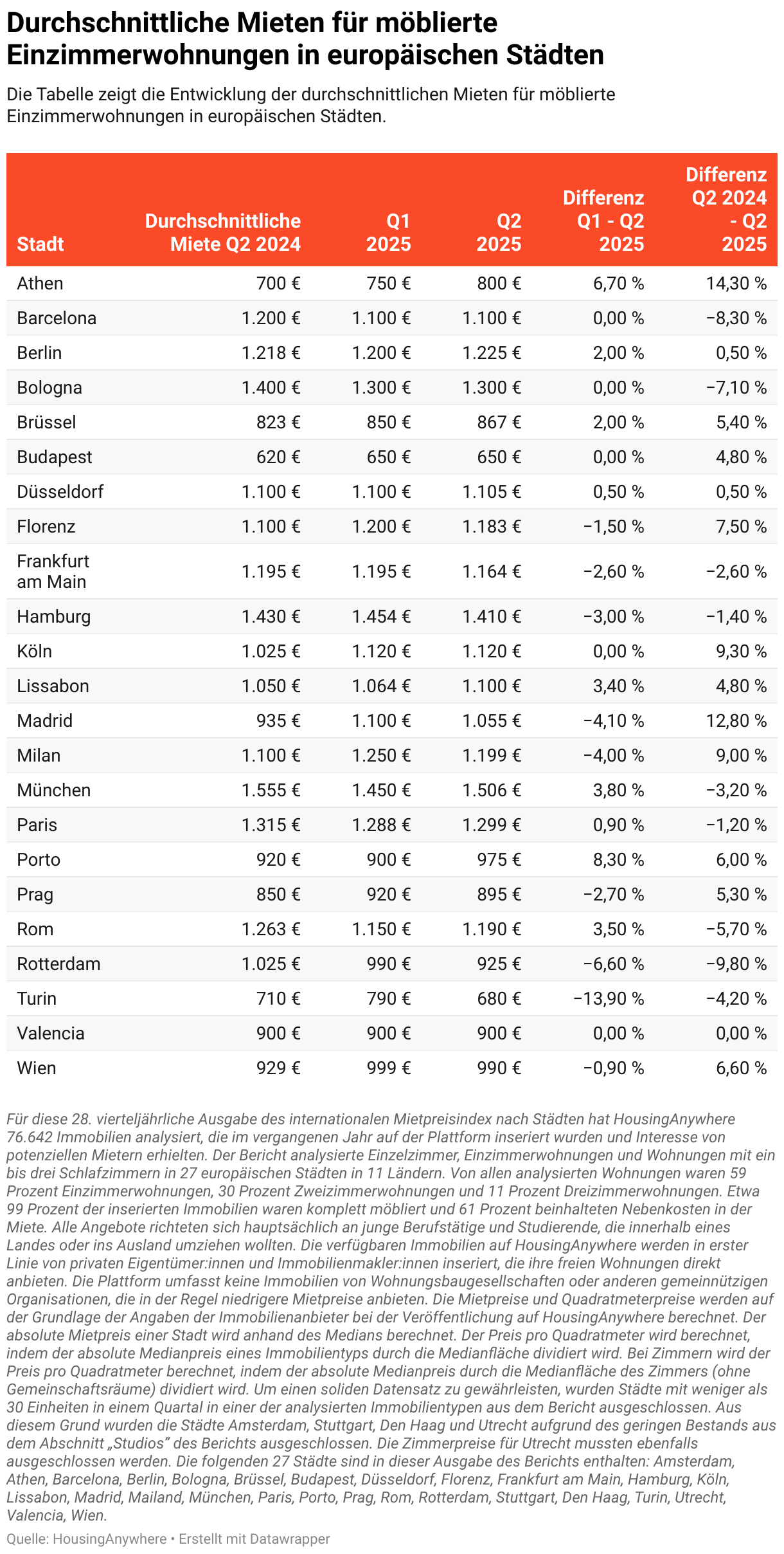 Die Tabelle zeigt die Entwicklung der durchschnittlichen Mieten für möblierte Einzimmerwohnungen in europäischen Städten.