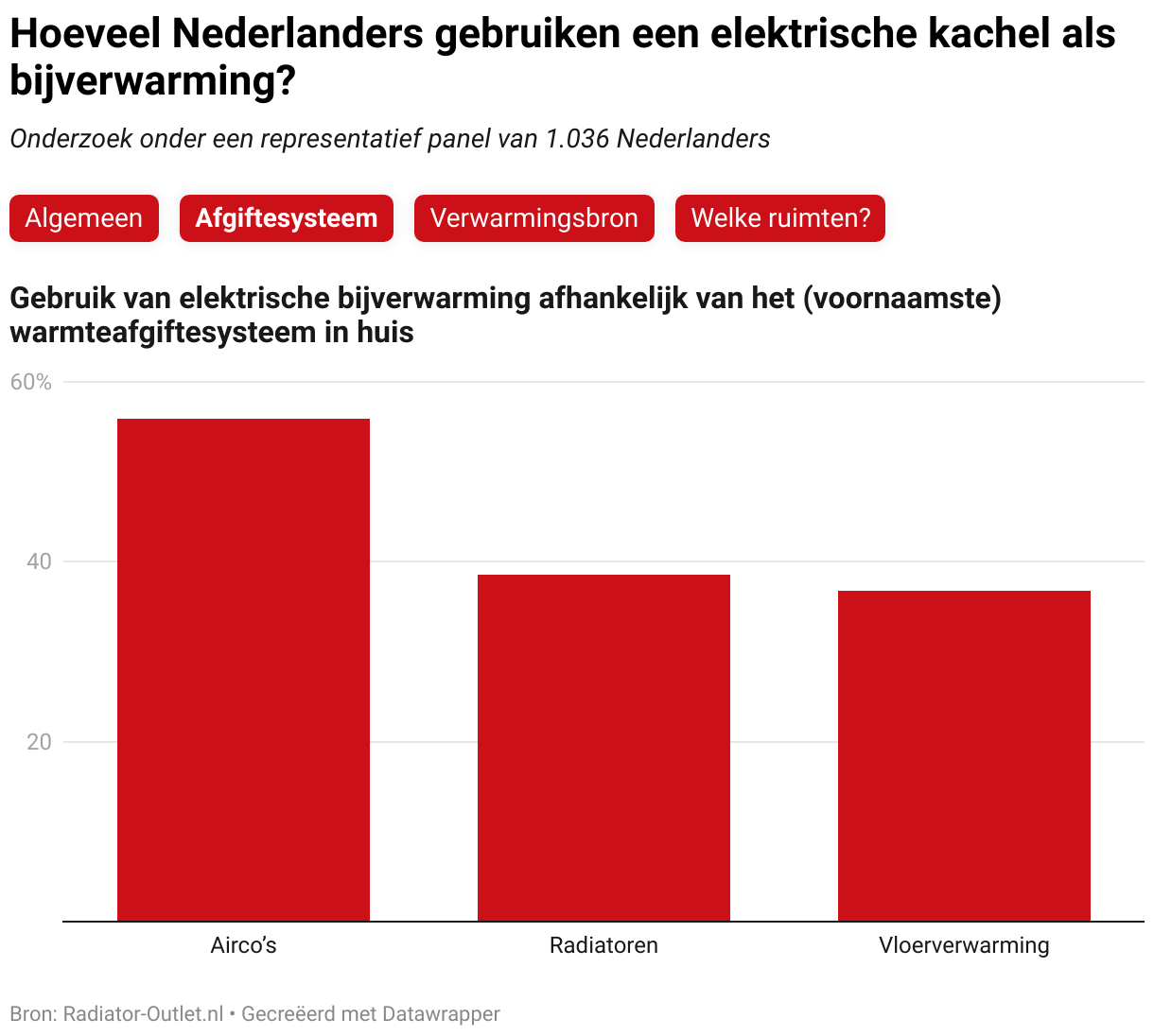 Onderzoek onder een representatief panel van 1.036 Nederlanders Algemeen Afgiftesysteem Verwarmingsbron Welke ruimten? Gebruik van elektrische bijverwarming afhankelijk van het (voornaamste) warmteafgiftesysteem in huis