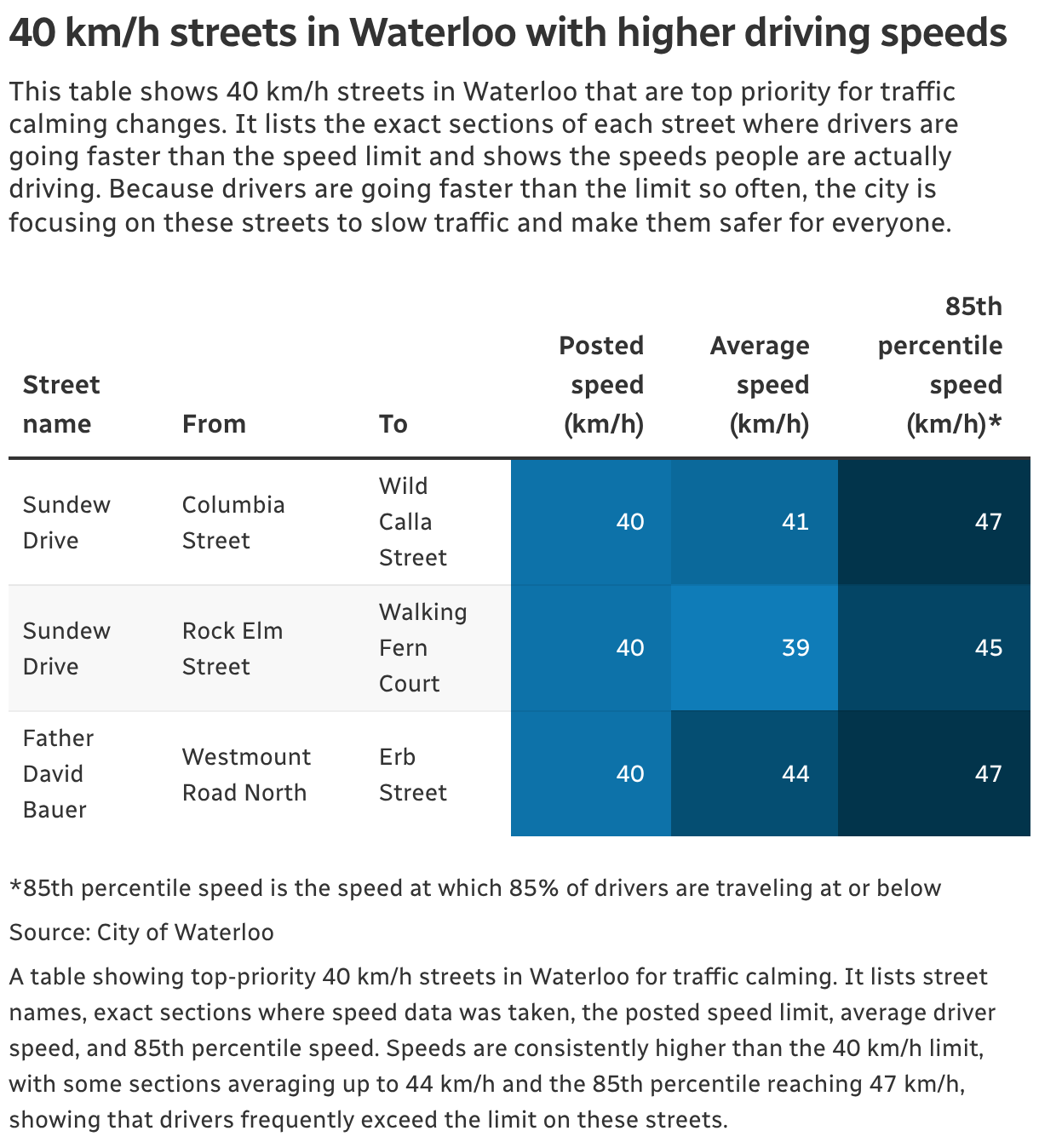 This table shows 40 km/h streets in Waterloo that are top priority for traffic calming changes. It lists the exact sections of each street where drivers are going faster than the speed limit and shows the speeds people are actually driving. Because drivers are going faster than the limit so often, the city is focusing on these streets to slow traffic and make them safer for everyone.