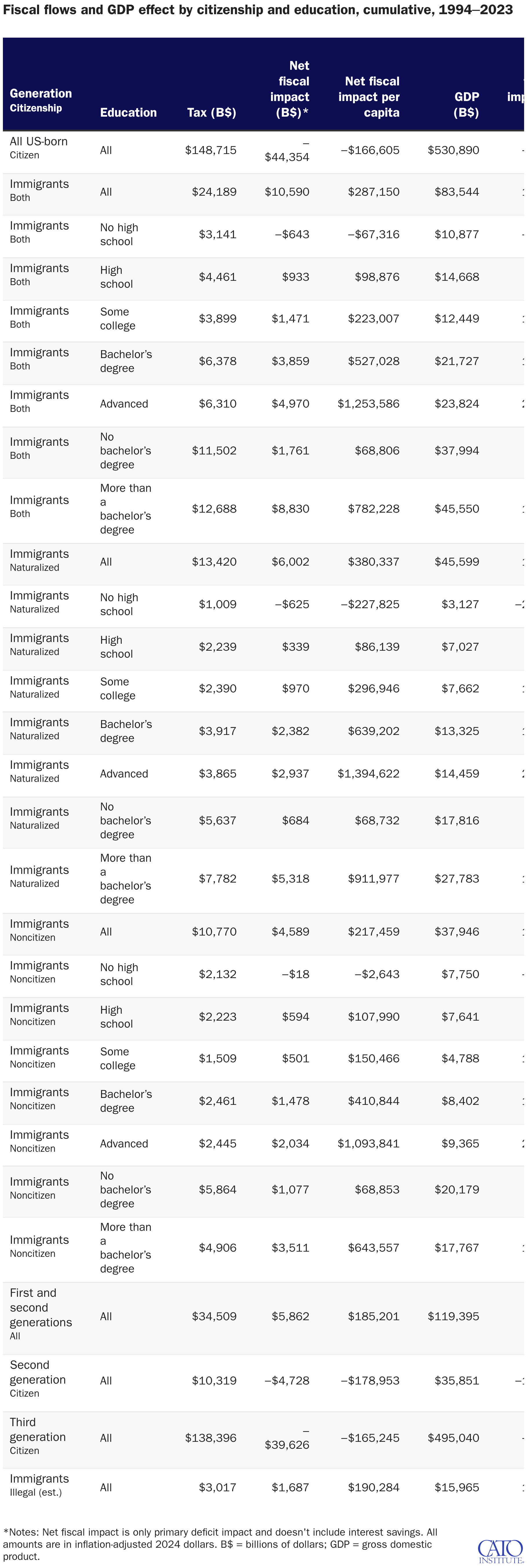 Fiscal flows and GDP effect by citizenship and education, cumulative, 1994