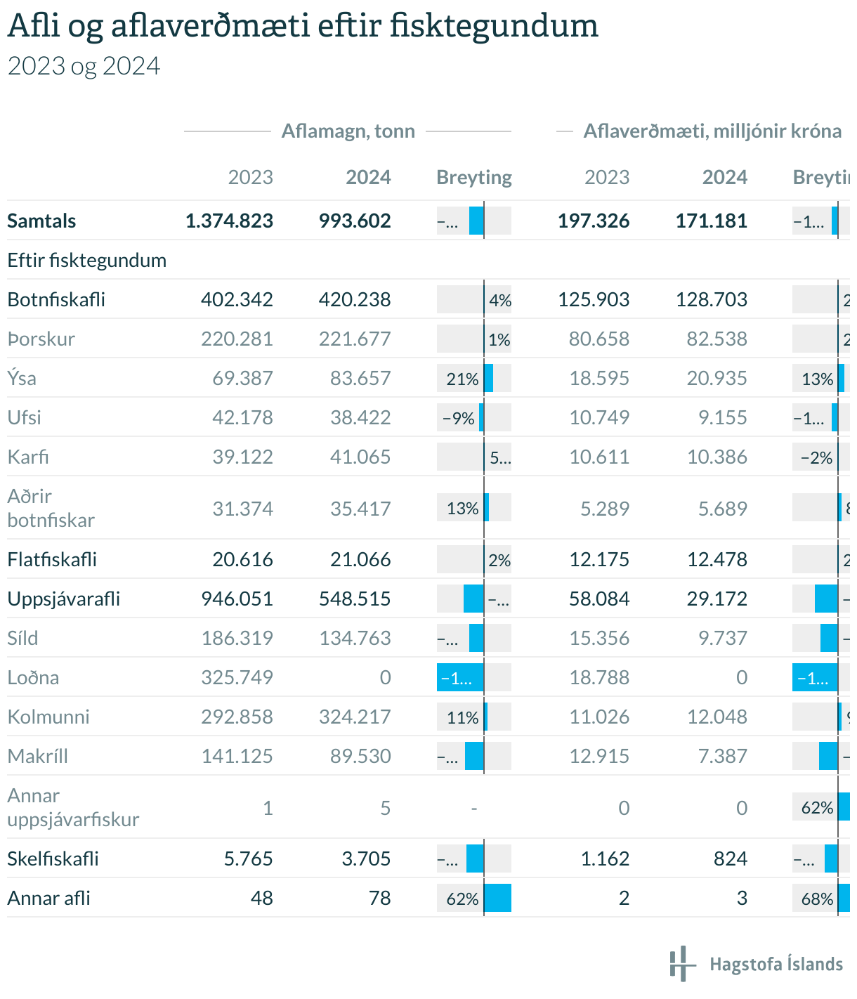 Afli og aflaverðmæti eftir fisktegundum
