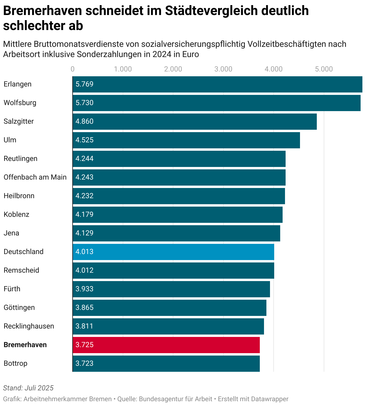 Mittlere Bruttomonatsverdienste von sozialversicherungspflichtig Vollzeitbeschäftigten nach Arbeitsort inklusive Sonderzahlungen in 2024 in Euro