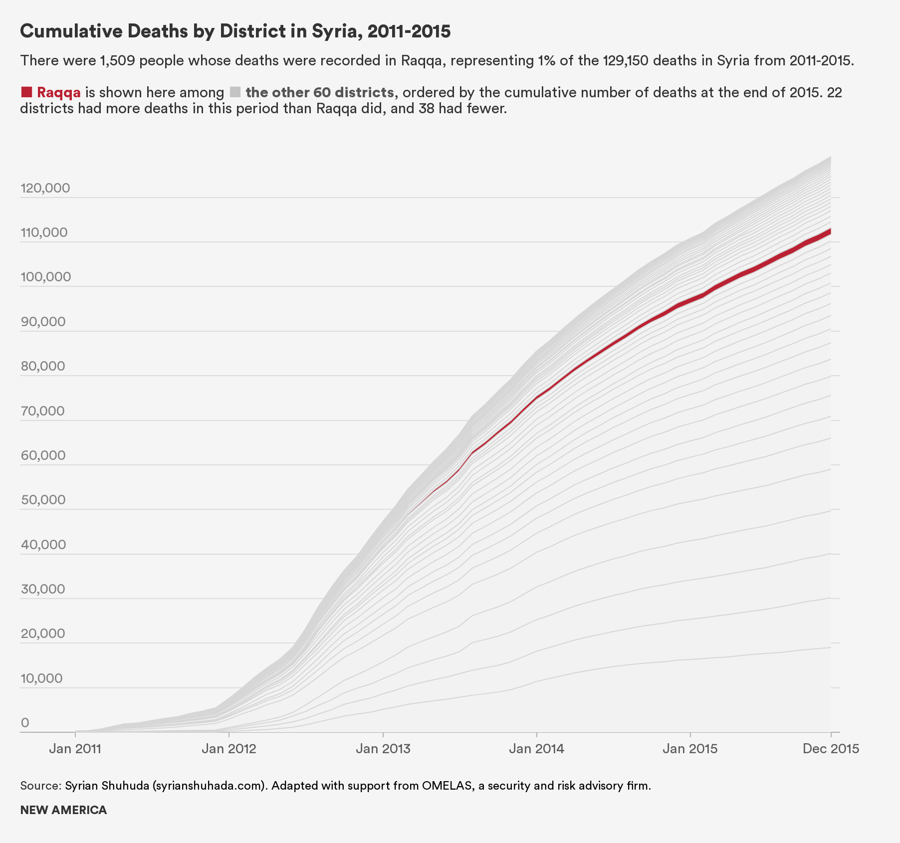 the other 60 districts, ordered by the cumulative number of deaths at the end of 2015. 22 districts had more deaths in this period than Raqqa did, and 38 had fewer.