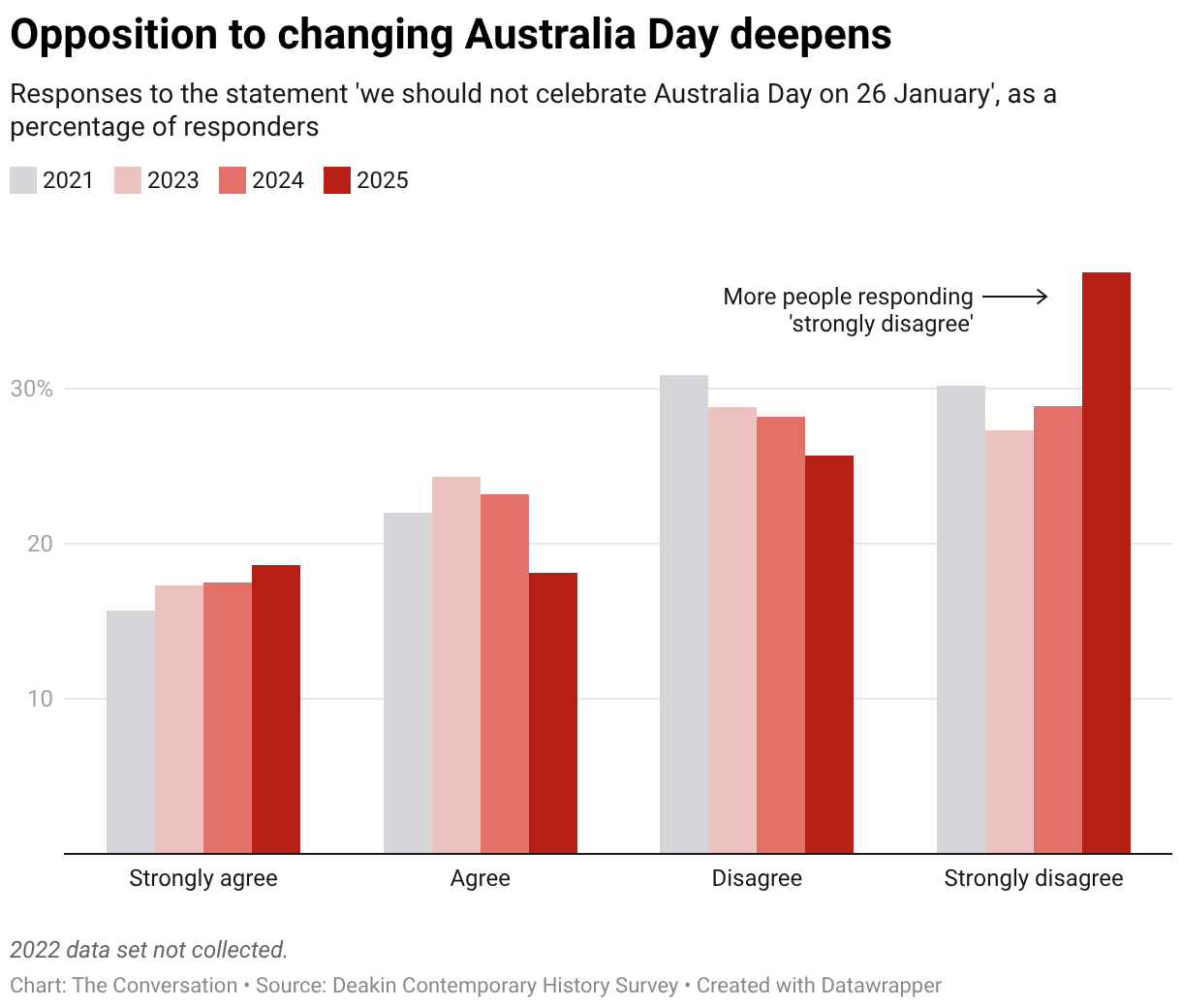 Responses to the statement 'we should not celebrate Australia Day on 26 January', as a percentage of responders