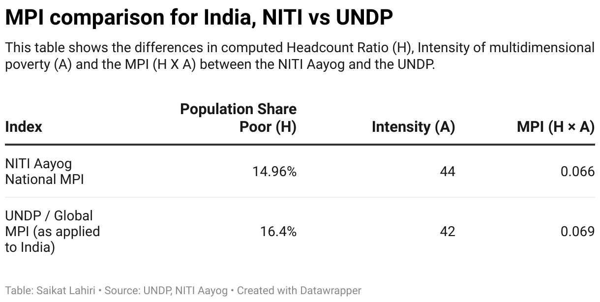 This table shows the differences in computed Headcount Ratio (H), Intensity of multidimensional poverty (A) and the MPI (H X A) between the NITI Aayog and the UNDP.