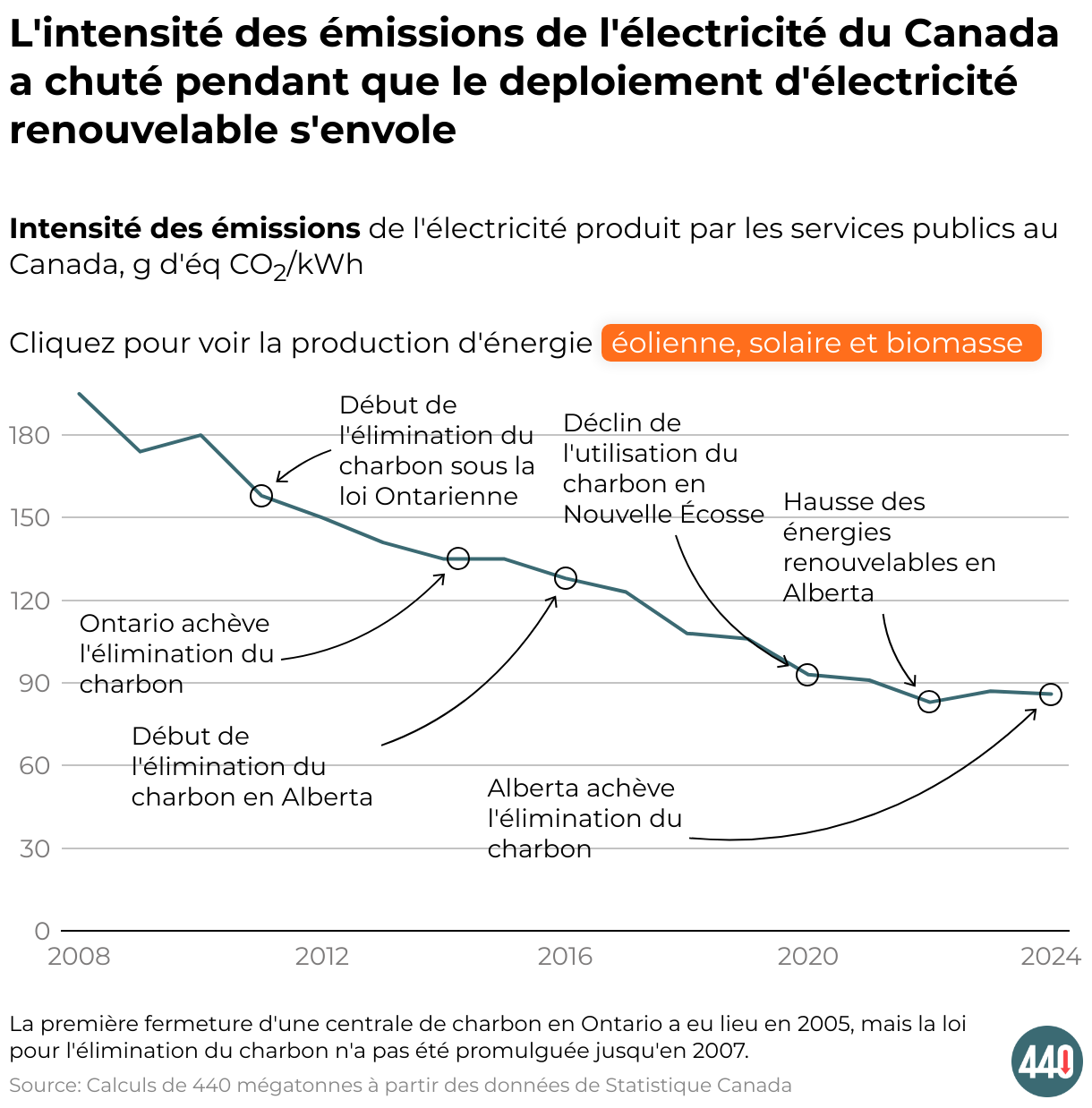 Intensité des émissions de l'électricité produit par les services publics au Canada, g d'éq CO2/kWh Cliquez pour voir la production d'énergie éolienne, solaire et biomasse