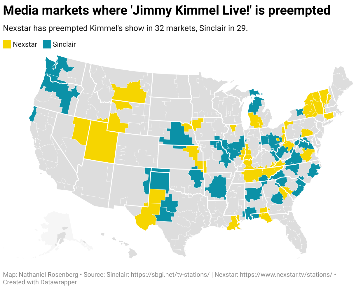 Nexstar has preempted Kimmel's show in 32 markets, Sinclair in 29.
