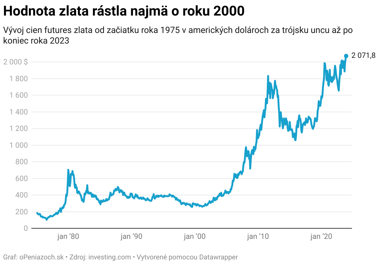 Vývoj cien futures zlata od začiatku roka 1975 v amerických dolároch za trójsku uncu až po koniec roka 2023