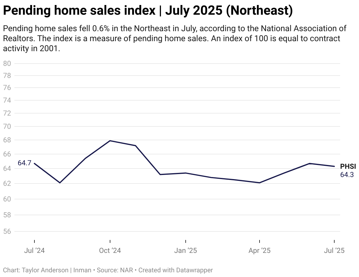Pending home sales fell 0.6% in the Northeast in July, according to the National Association of Realtors. The index is a measure of pending home sales. An index of 100 is equal to contract activity in 2001.