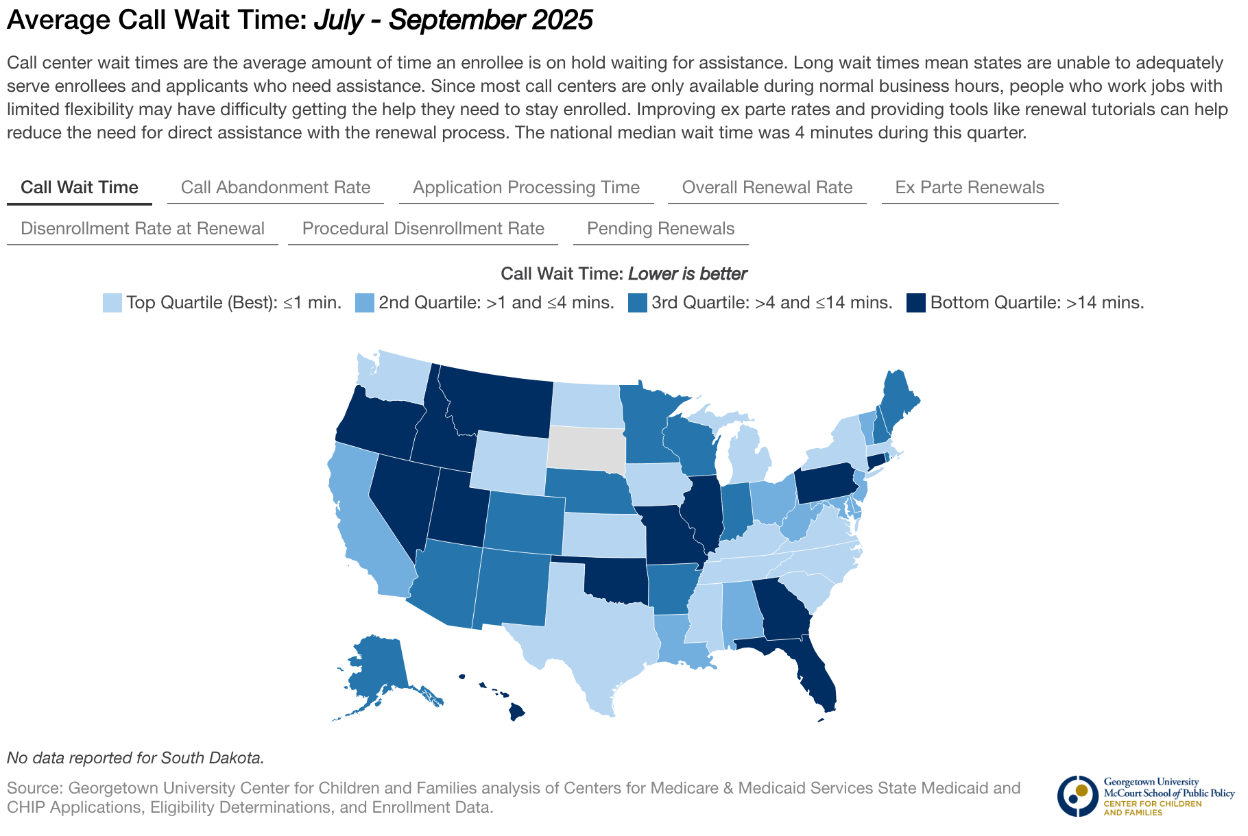 Call center wait times are the average amount of time an enrollee is on hold waiting for assistance. Long wait times mean states are unable to adequately serve enrollees and applicants who need assistance. Since most call centers are only available during normal business hours, people who work jobs with limited flexibility may have difficulty getting the help they need to stay enrolled. Improving ex parte rates and providing tools like renewal tutorials can help reduce the need for direct assistance with the renewal process. The national median wait time was 4 minutes during this quarter.