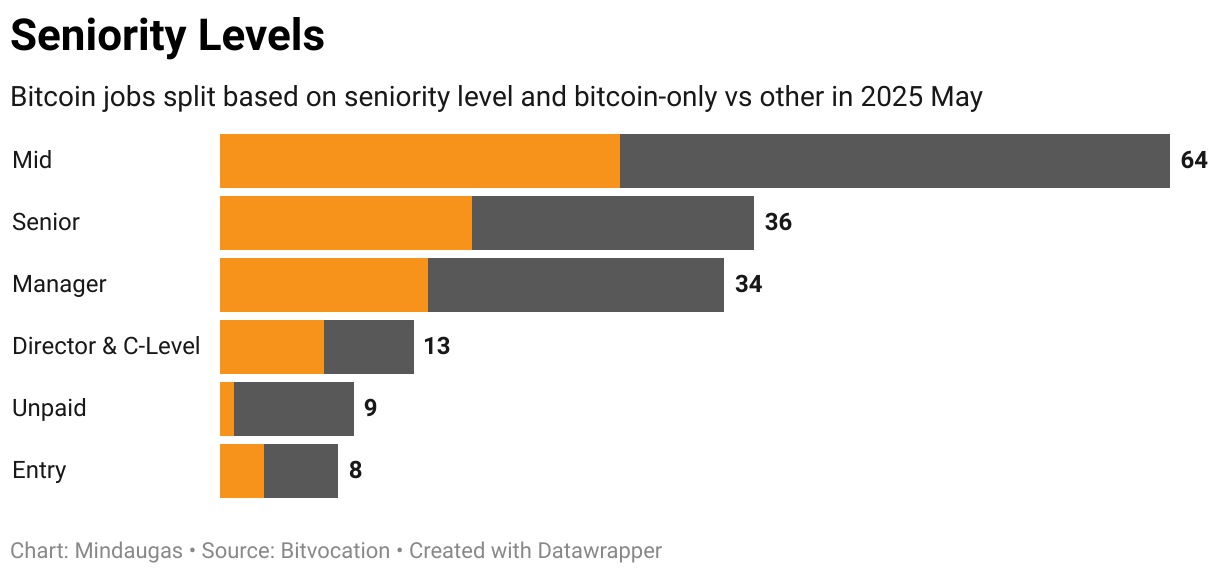 Bitcoin jobs split based on seniority level and bitcoin-only vs other in 2025 May