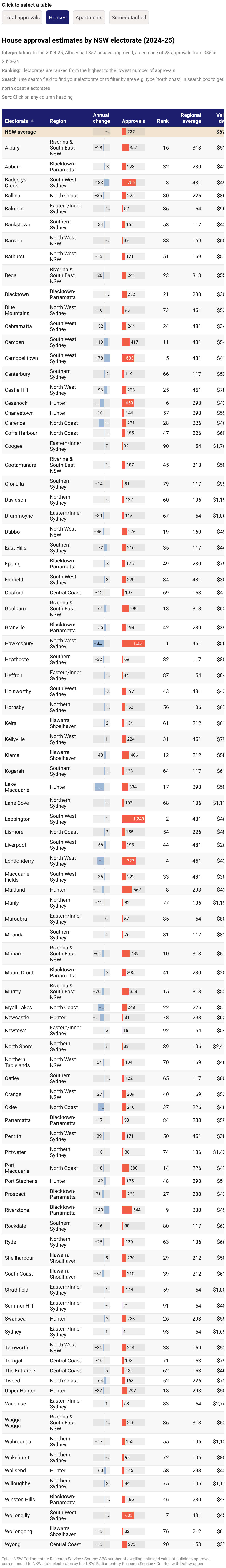 Interpretation: In the 2024-25, Albury had 357 houses approved, a decrease of 28 approvals from 385 in 2023-24