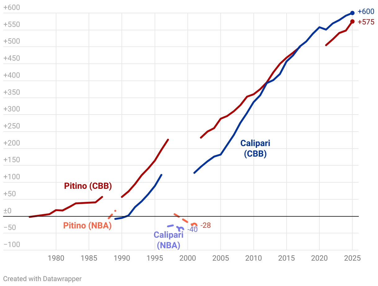 Cumulative games above/below .500 for Rick Pitino and John Calipari at the college or NBA level, by season