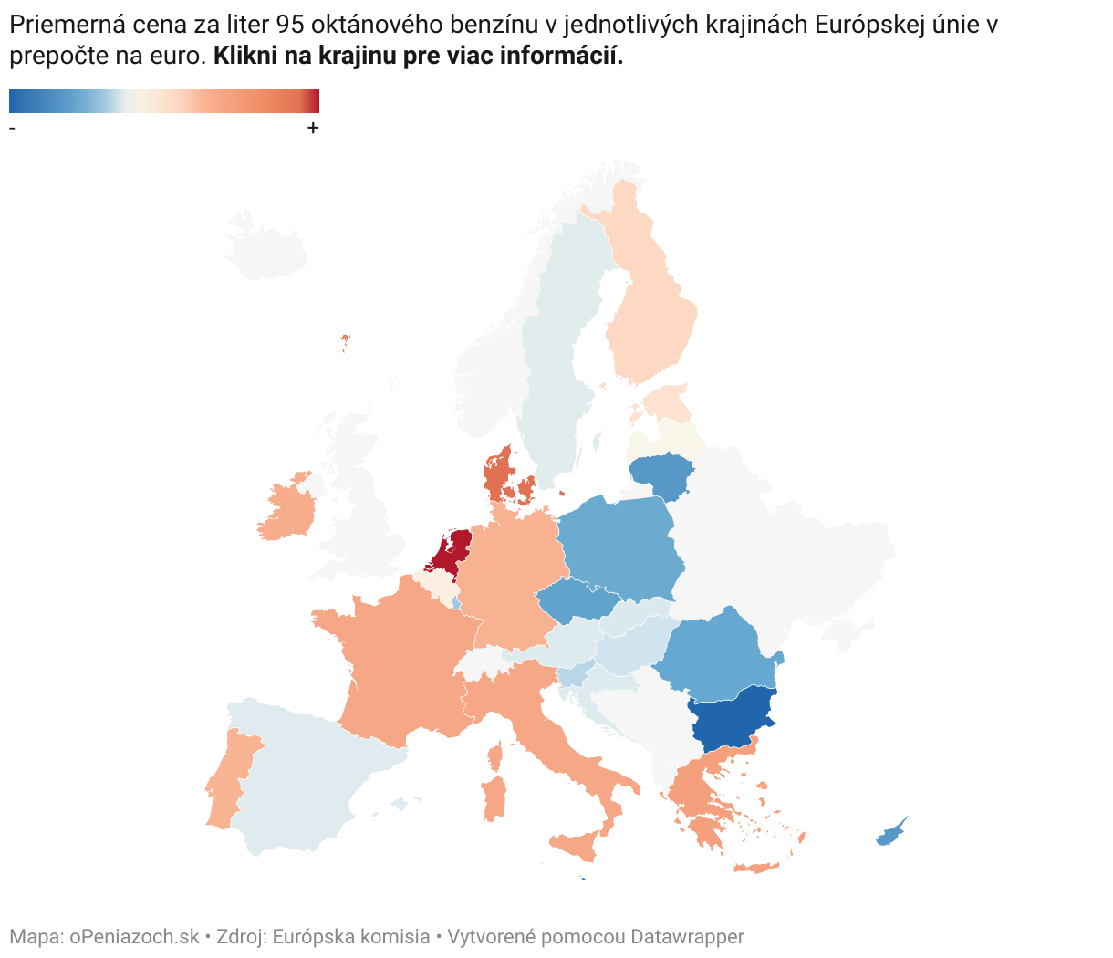 Priemerná cena za liter 95 oktánového benzínu v jednotlivých krajinách Európskej únie v prepočte na euro. Klikni na krajinu pre viac informácií.