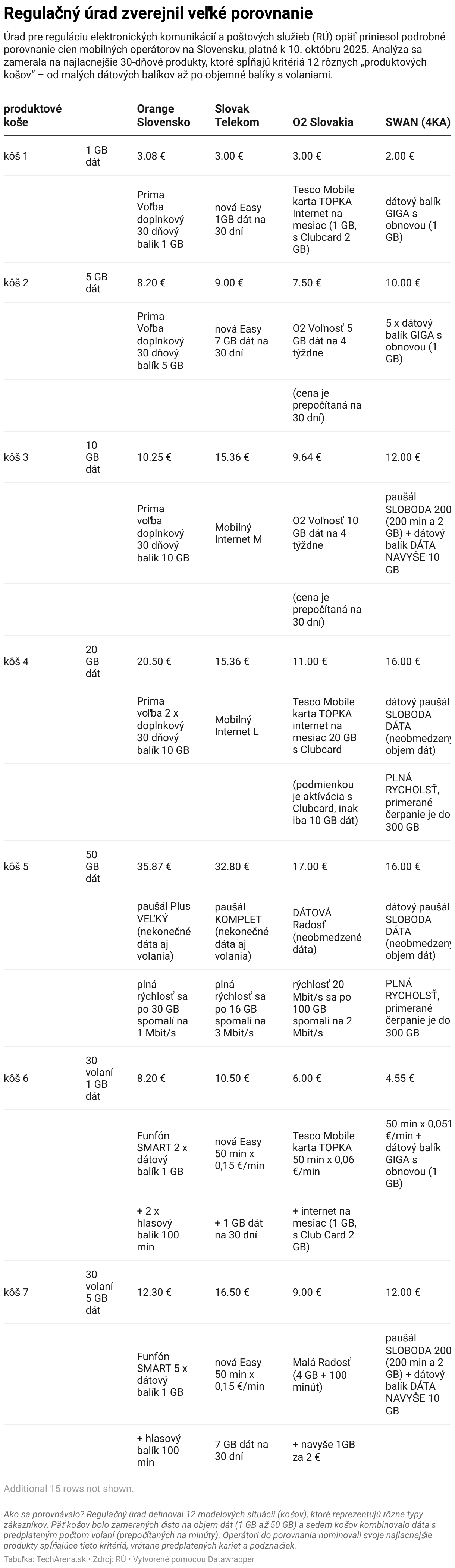 Úrad pre reguláciu elektronických komunikácií a poštových služieb (RÚ) opäť priniesol podrobné porovnanie cien mobilných operátorov na Slovensku, platné k 10. októbru 2025. Analýza sa zamerala na najlacnejšie 30-dňové produkty, ktoré spĺňajú kritériá 12 rôznych „produktových košov“ – od malých dátových balíkov až po objemné balíky s volaniami.