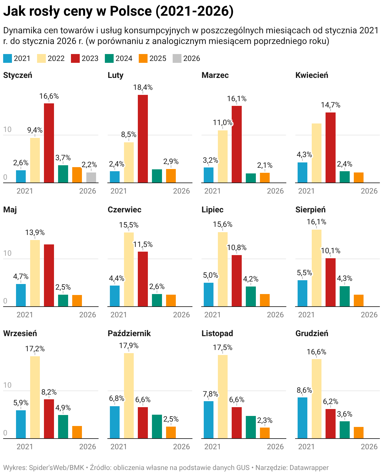 Dynamika cen towarów i usług konsumpcyjnych w poszczególnych miesiącach od stycznia 2021 r. do stycznia 2026 r. (w porównaniu z analogicznym miesiącem poprzedniego roku)