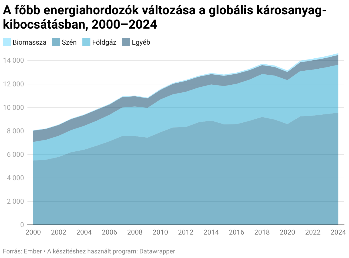 A főbb energiahordozók változása a globális károsanyag-kibocsátásban, 2000–2024