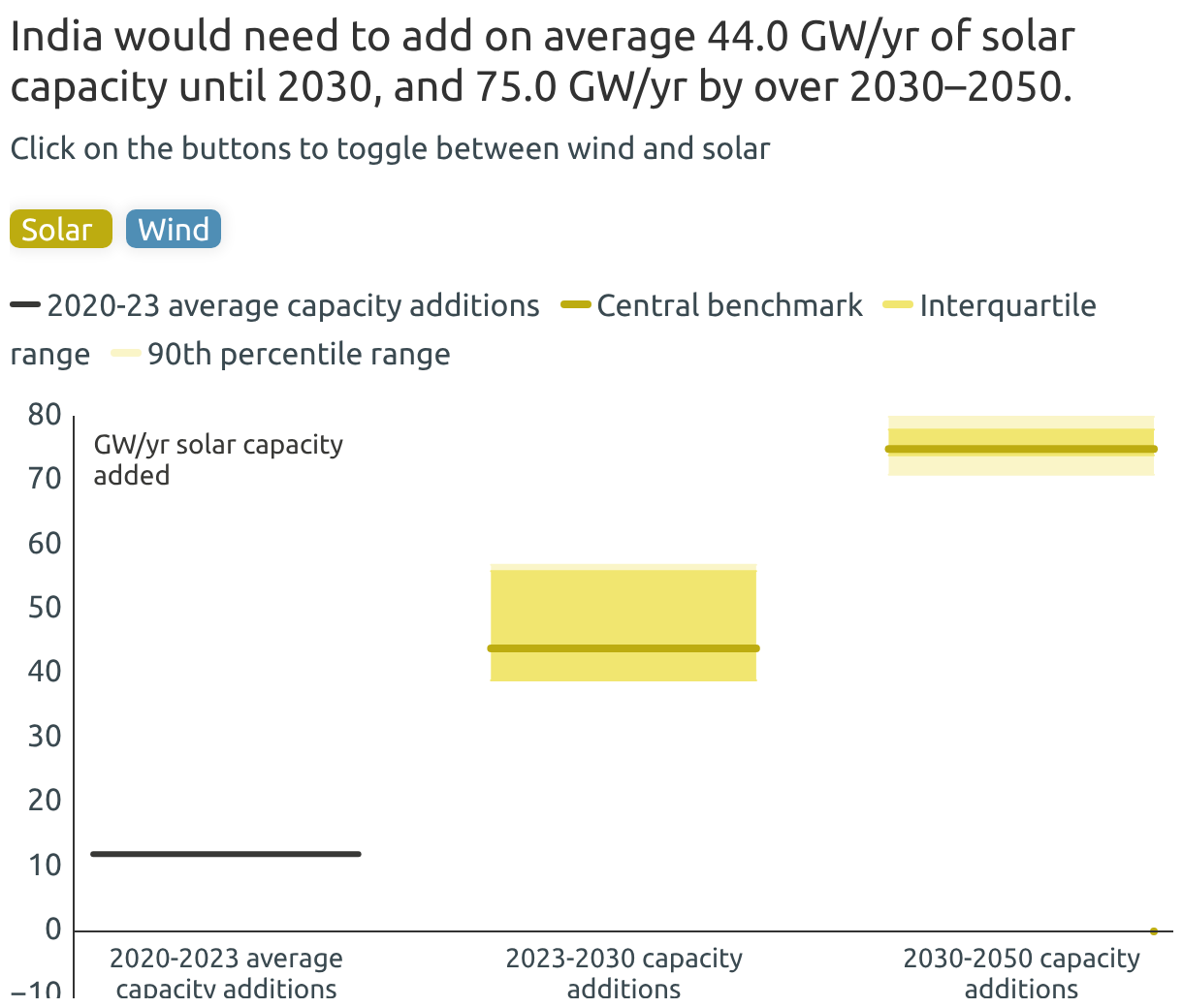 India would need to add on average 44.0 GW/yr of solar capacity until 2030, and 75.0 GW/yr by over 2030–2050.