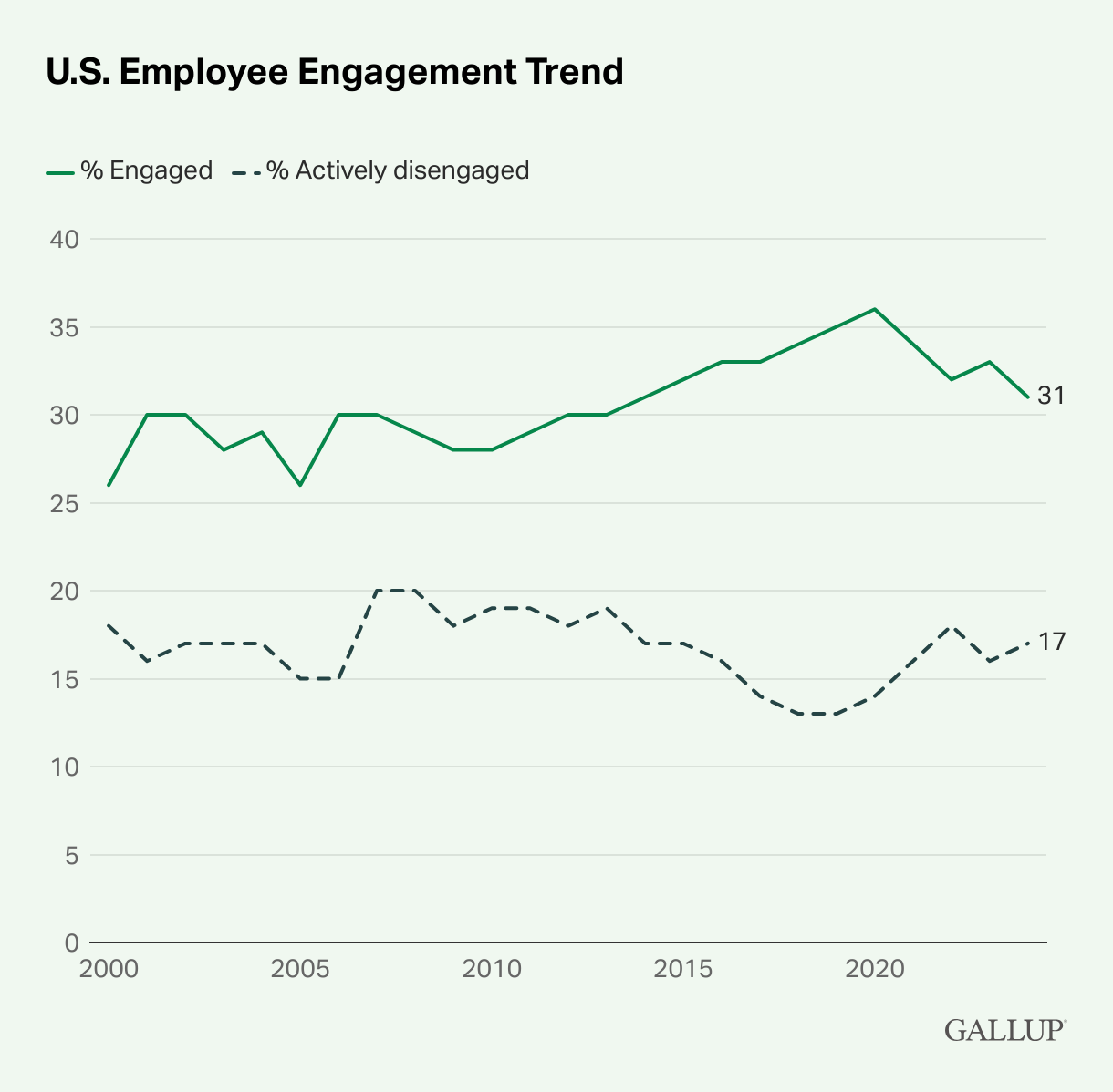 Line chart. U.S. Employee Engagement Trend. In the latest reading, from a November 2024 Gallup poll, employee engagement trends show 31% of U.S. employees are engaged, and 17% are actively disengaged. The percentage of engaged employees is higher than the 26% it was when measuring began in 2000, but it is lower than 2020’s high of 36%.