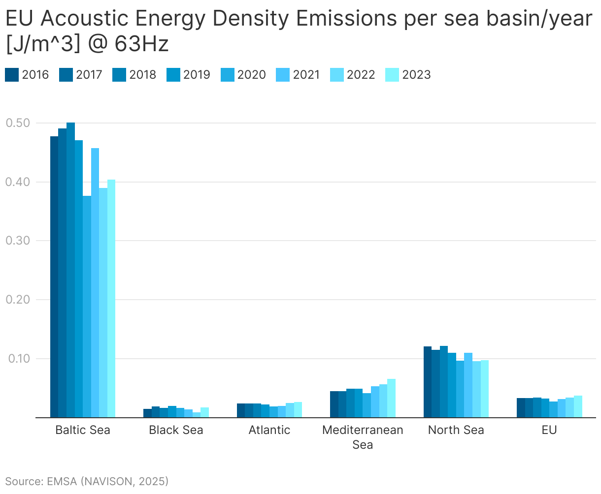 EU Acoustic Energy Density Emissions per sea basin/year [J/m^3] @ 63Hz
