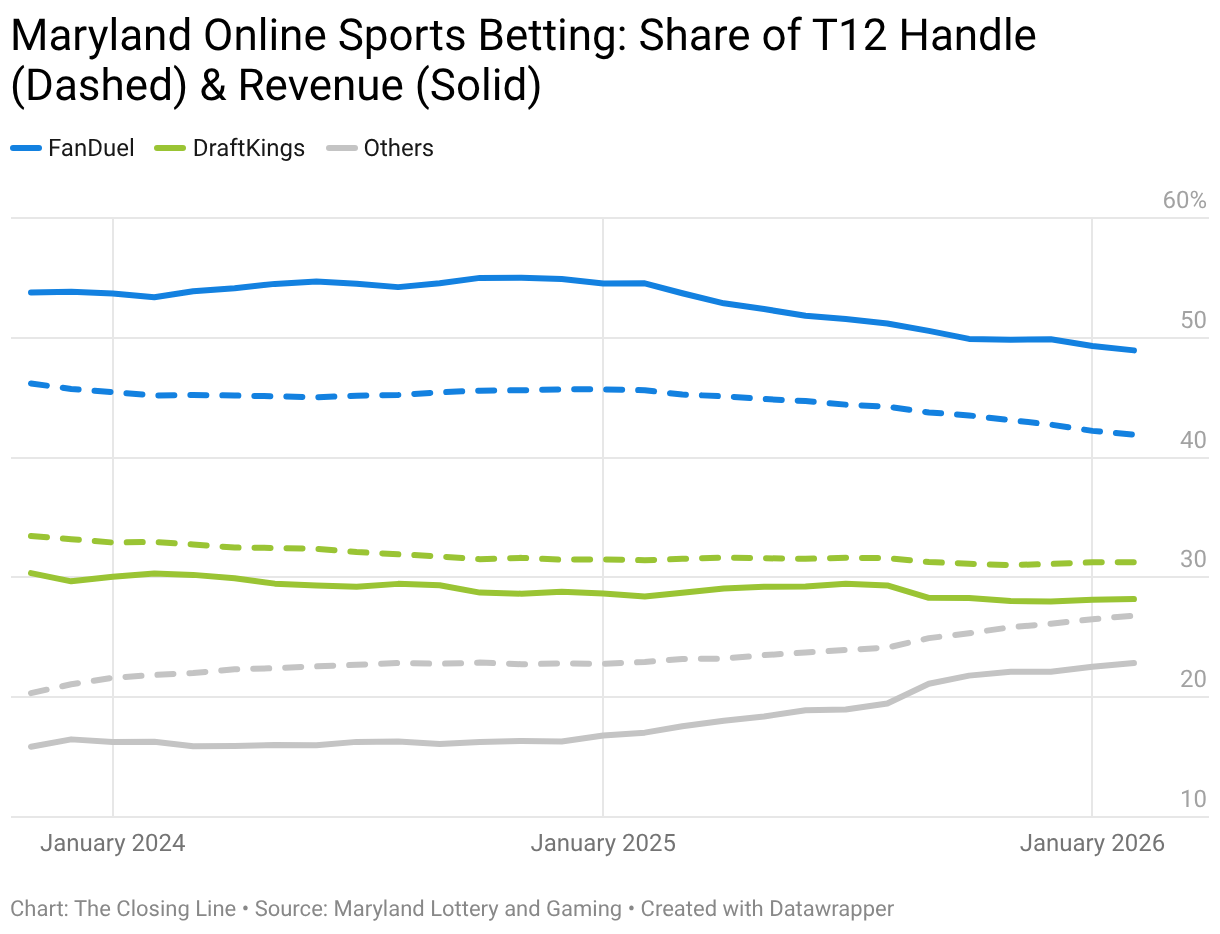 Maryland Online Sports Betting: Share of T12 Handle (Dashed) & Revenue (Solid)