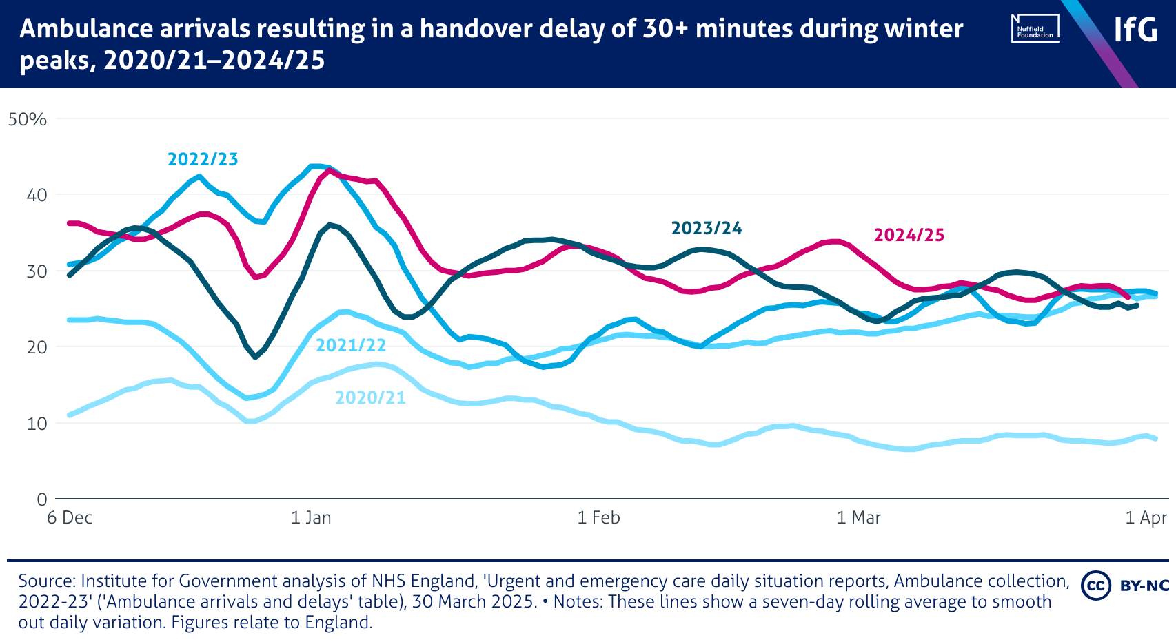 A line chart from the Institute for Government showing Ambulance arrivals resulting in a handover delay of 30+ minutes during winter peaks, 2020/21–2024/25. The share of delayed handovers rose sharply between 2020/21 and 2022/23, peaking at 43.7% in early 2023. Performance improved slightly in 2023/24 but remains worse than before the pandemic, with nearly 30% of ambulance arrivals resulting in handover delays of 30+ minutes in March 2025.