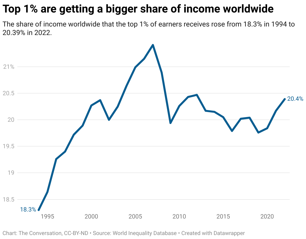The share of income worldwide that the top 1% of earners receives rose from 18.3% in 1994 to 20.39% in 2022.