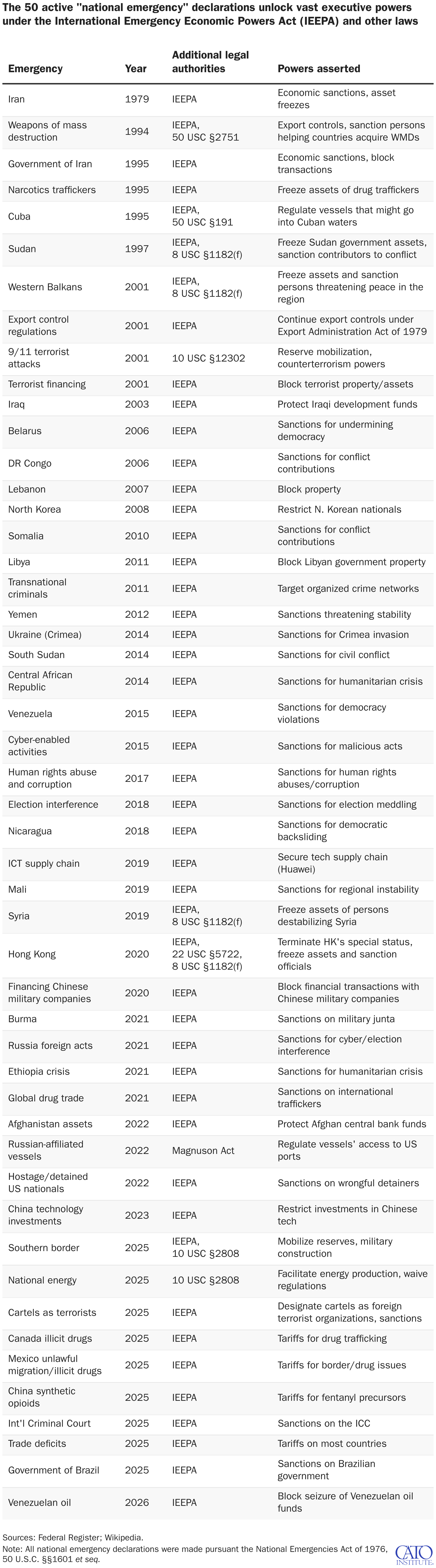 The 50 active "national emergency" declarations unlock vast executive powers under the International Emergency Economic Powers Act (IEEPA) and other laws