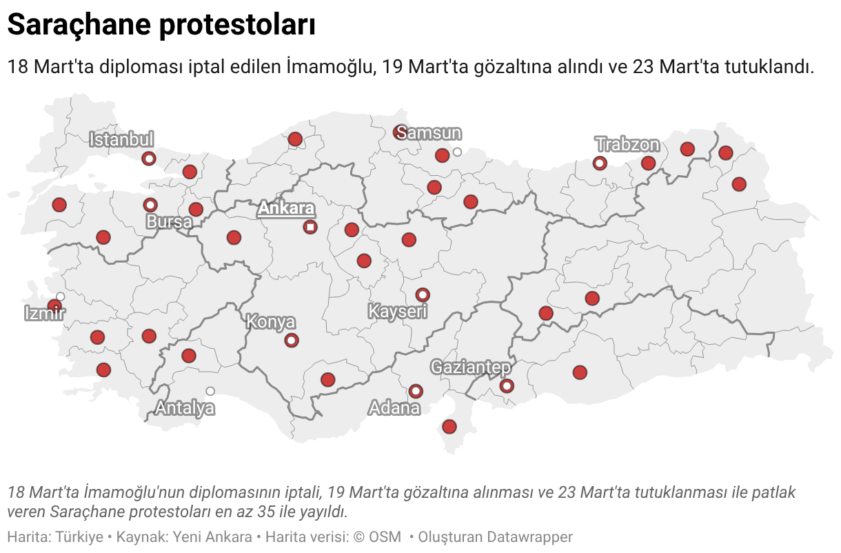 18 Mart'ta diploması iptal edilen İmamoğlu, 19 Mart'ta gözaltına alındı ve 23 Mart'ta tutuklandı.