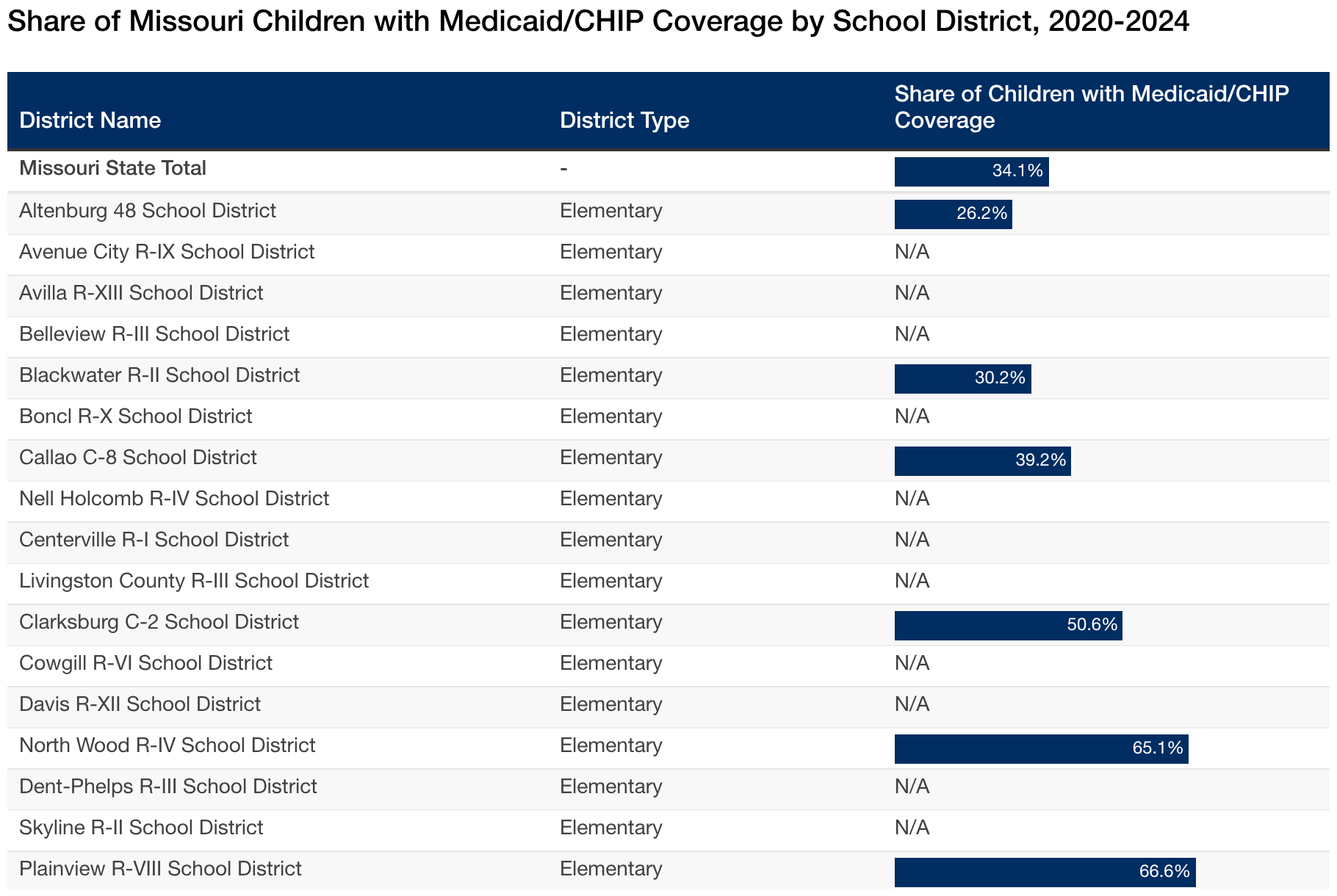 Share of Missouri Children with Medicaid/CHIP Coverage by School District, 2020-2024
