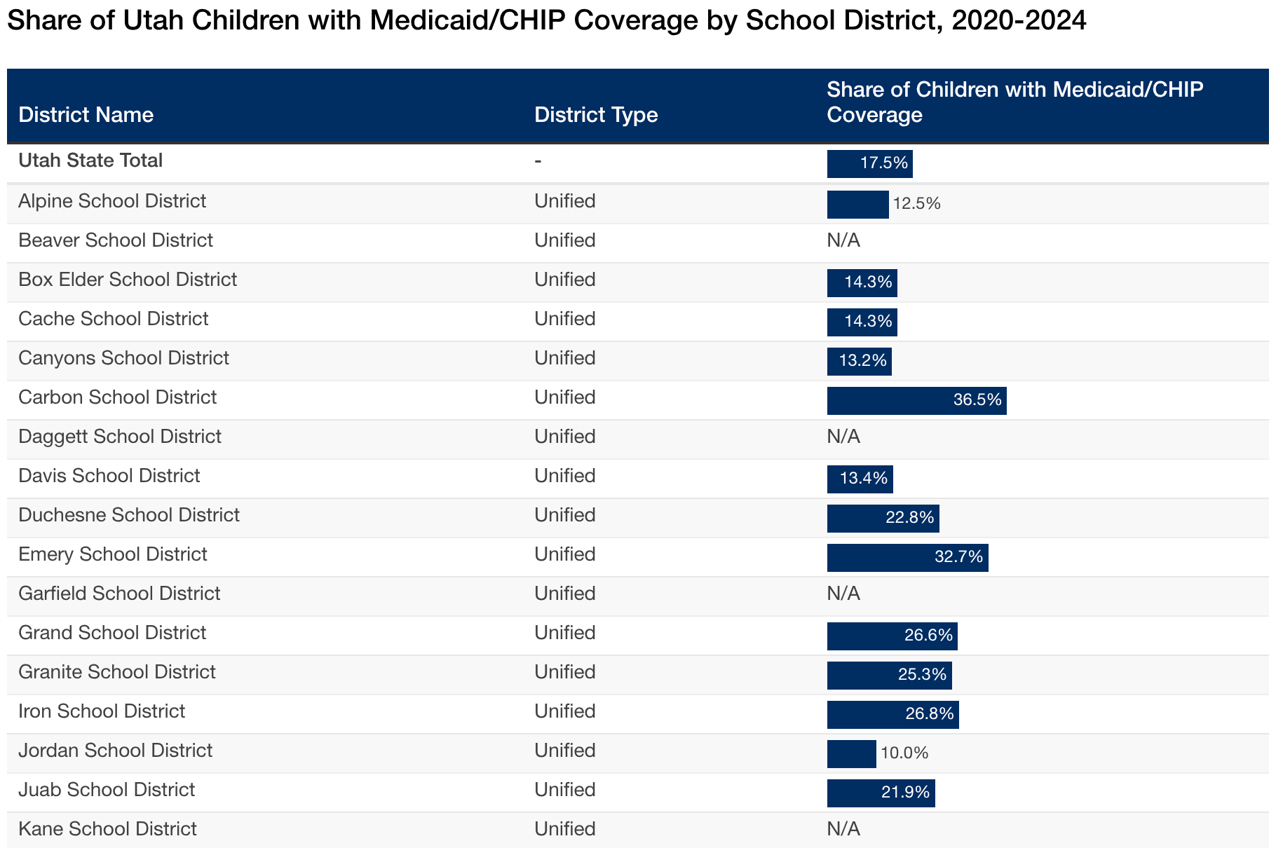 Share of Utah Children with Medicaid/CHIP Coverage by School District, 2020-2024