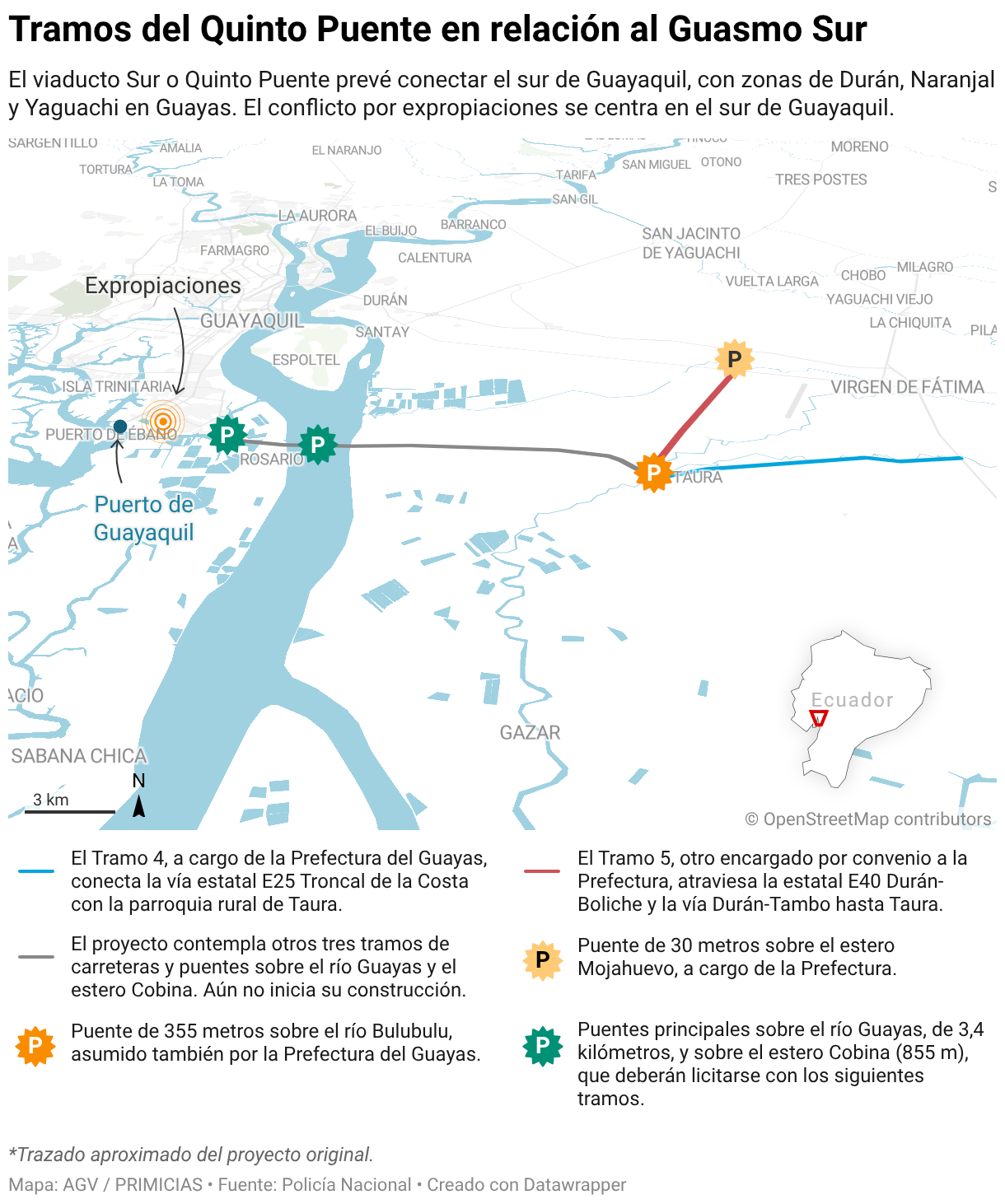 El viaducto Sur o Quinto Puente prevé conectar el sur de Guayaquil, con zonas de Durán, Naranjal y Yaguachi en Guayas. El conflicto por expropiaciones se centra en el sur de Guayaquil.