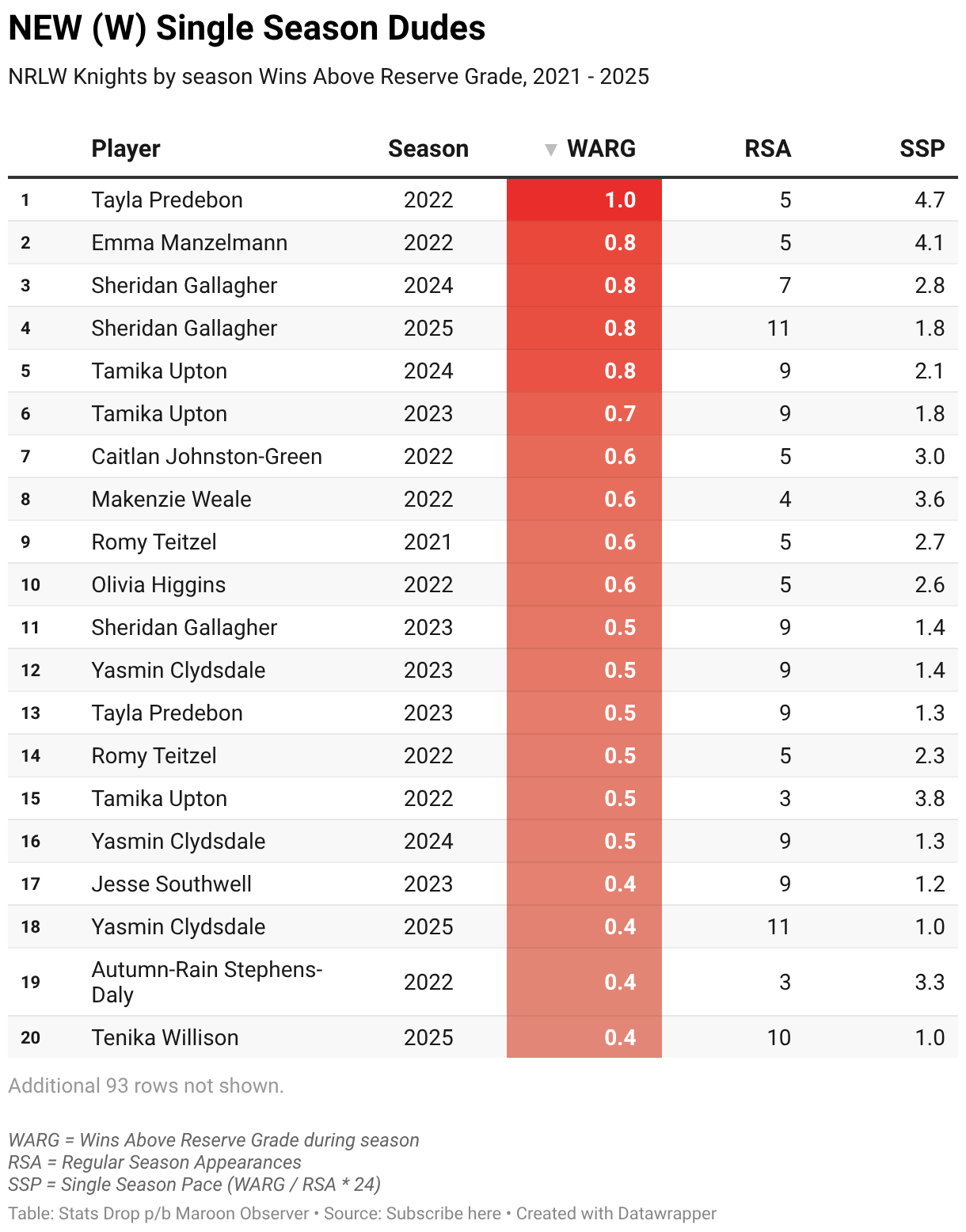 NRLW Knights by season Wins Above Reserve Grade, 2021 - 2025