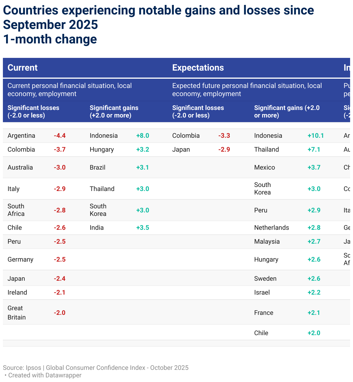 In contrast, consumer confidence is mixed in Latin America. Argentina (-3.5 points) and Colombia (-3.1 points) show the largest declines among all countries, while Brazil (+2.2 points) is up significantly.