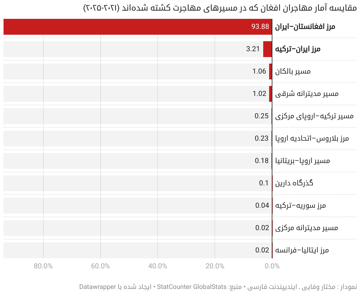 مقایسه آمار مهاجران افغان که در مسیرهای مهاجرت کشته شدهاند (۲۰۲۱-۲۰۲۵)