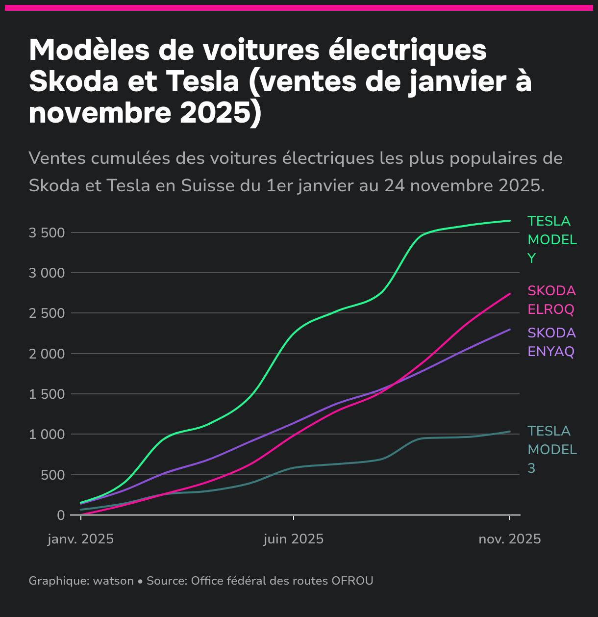 Ventes cumulées des voitures électriques les plus populaires de Skoda et Tesla en Suisse du 1er janvier au 24 novembre 2025.