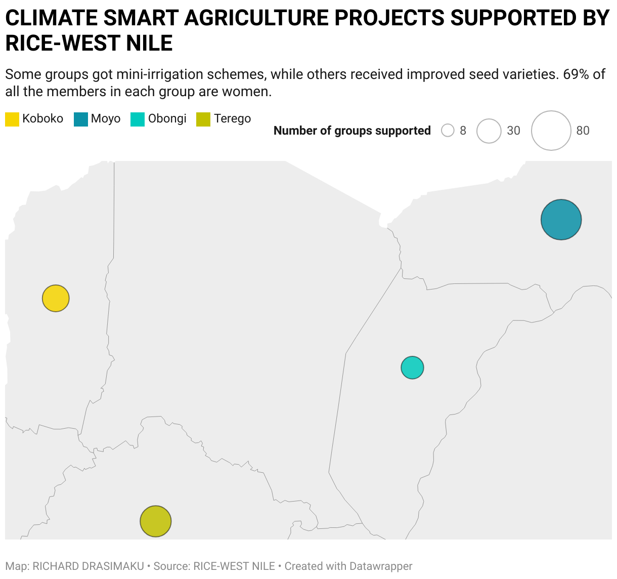Some groups got mini-irrigation schemes, while others received improved seed varieties. 69% of all the members in each group are women.
