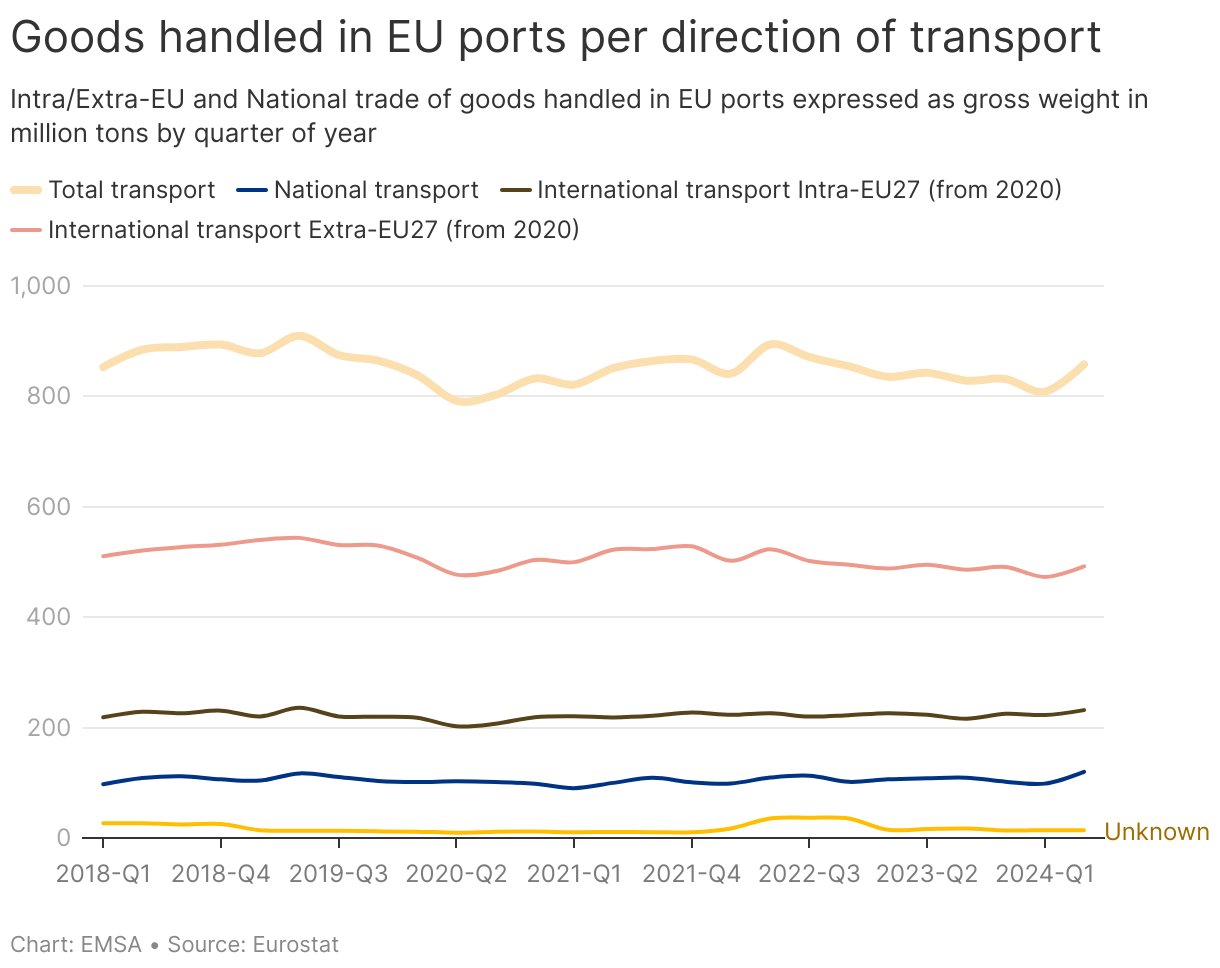 Intra/Extra-EU and National trade of goods handled in EU ports expressed as gross weight in million tons by quarter of year