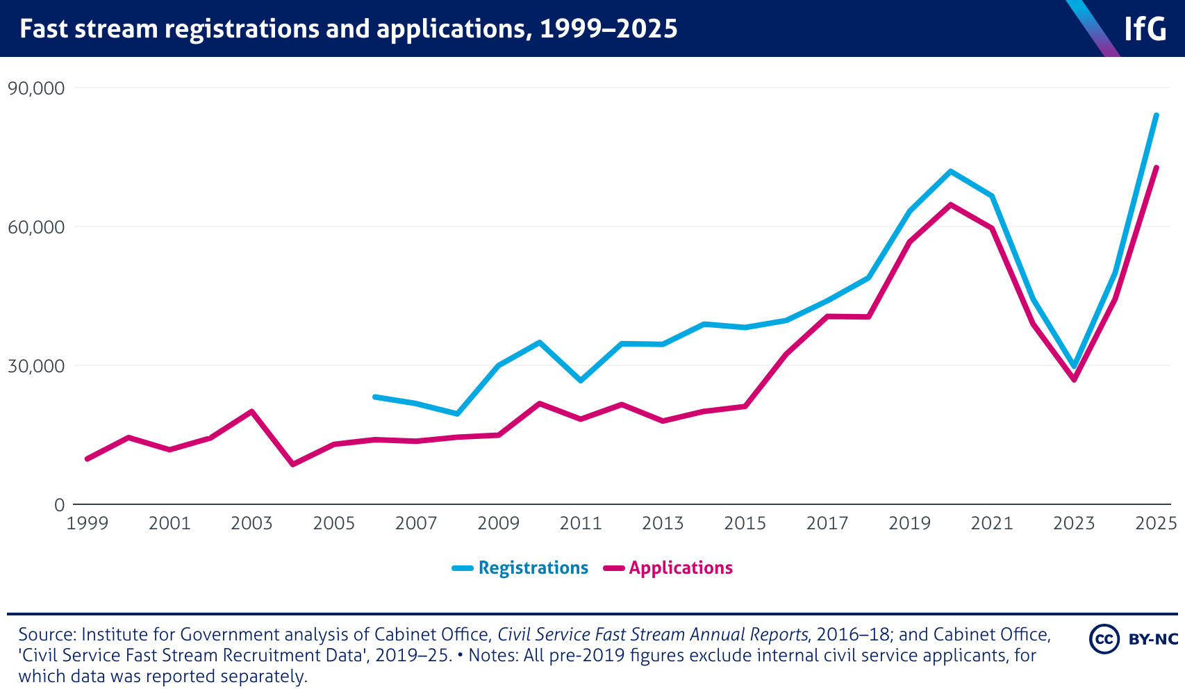 A line chart from the Institute for Government showing fast stream registrations and applications, 1999-2025, where both peaked in 2025, recovering from a post-pandemic slump.
