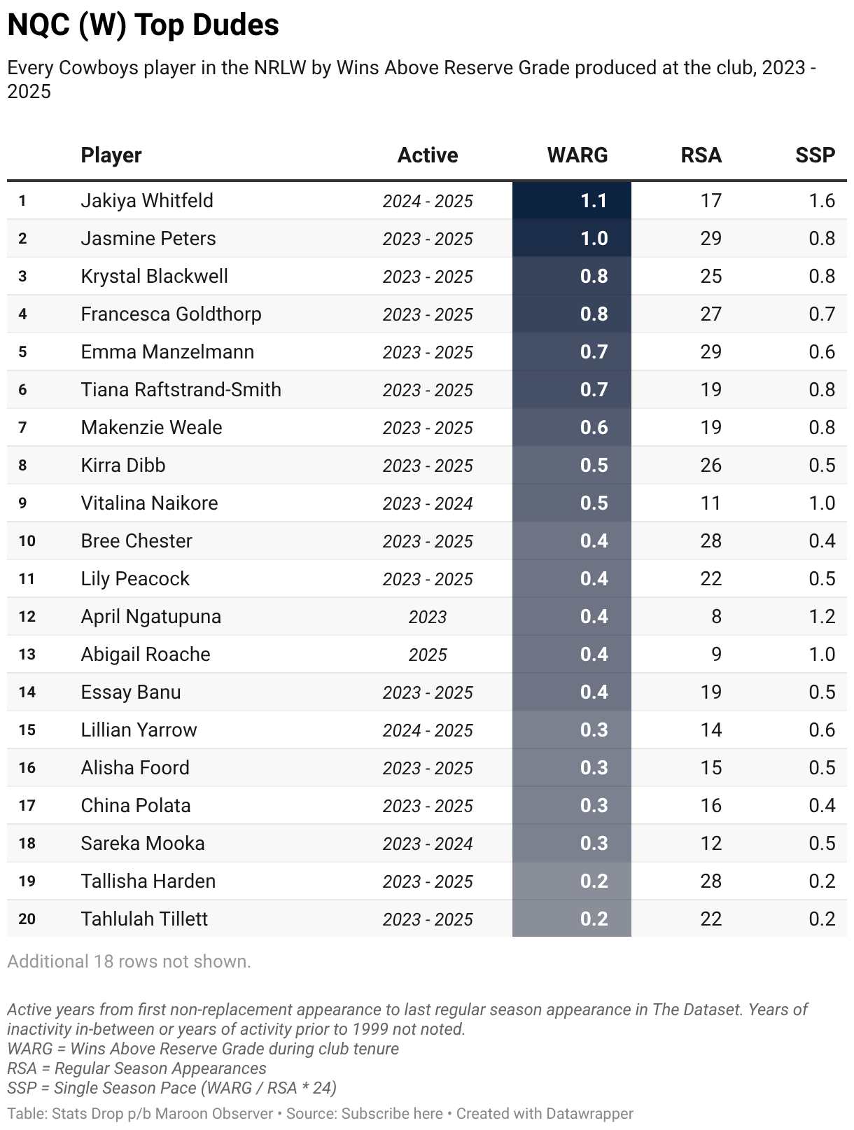 Every Cowboys player in the NRLW by Wins Above Reserve Grade produced at the club, 2023 - 2025