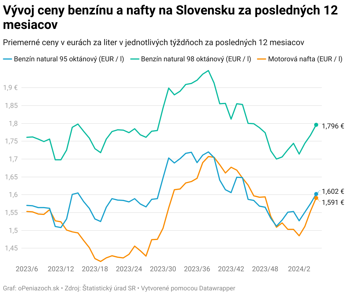 Priemerné ceny v eurách za liter v jednotlivých týždňoch za posledných 12 mesiacov