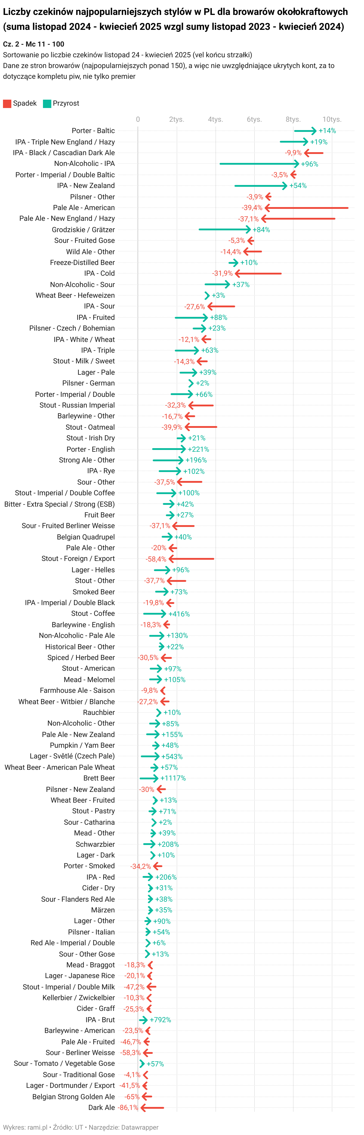 Liczby czekinów najpopularniejszych stylów w PL dla browarów okołokraftowych (suma listopad 2024 - kwiecień 2025 wzgl sumy listopad 2023 - kwiecień 2024)