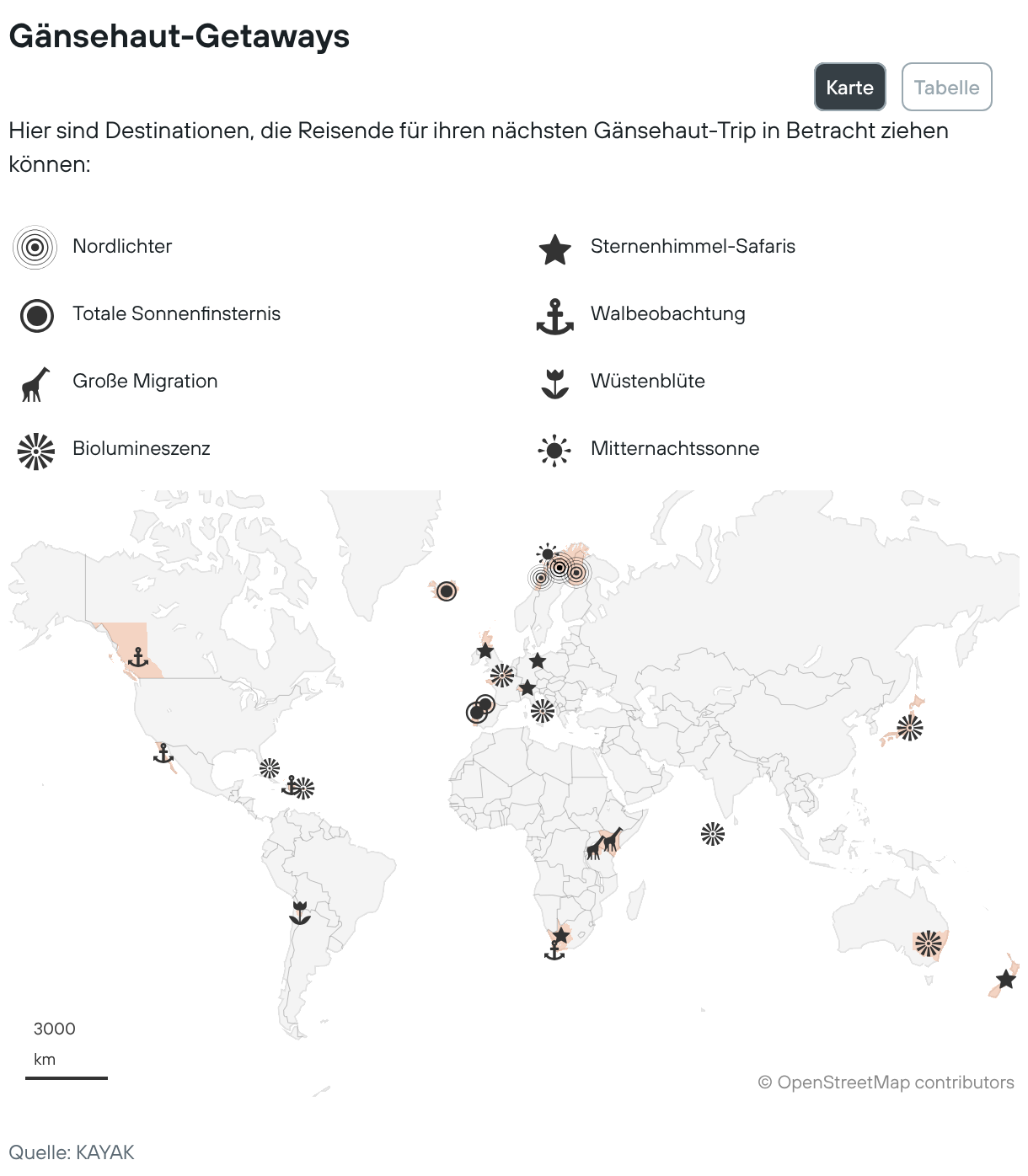 Hier sind Destinationen, die Reisende für ihren nächsten Gänsehaut-Trip in Betracht ziehen können: Karte Tabelle