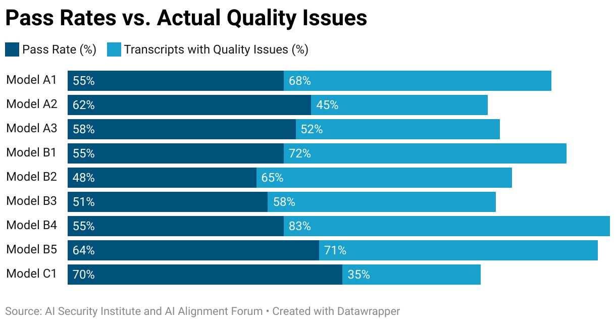 Bar chart comparing pass rates to percentage of transcripts with quality issues across different AI models