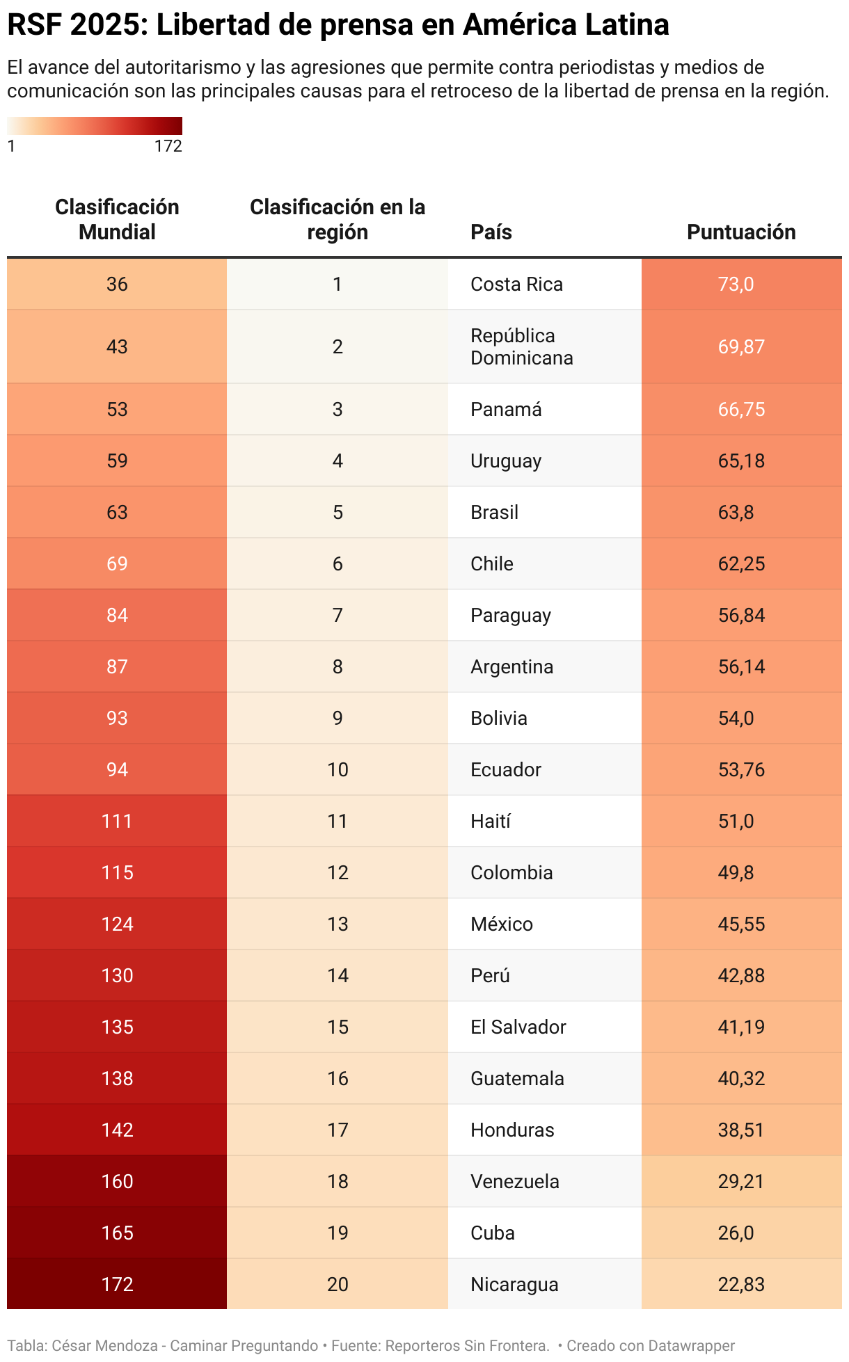 Es una tabla con los países de América Latina y la libertad de prensa que tienen según Reporteros Sin Fronteras.