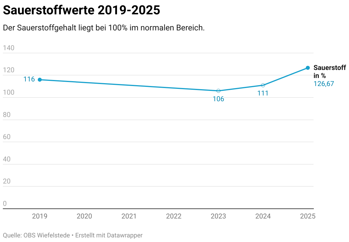 Der Sauerstoffgehalt liegt bei 100% im normalen Bereich.