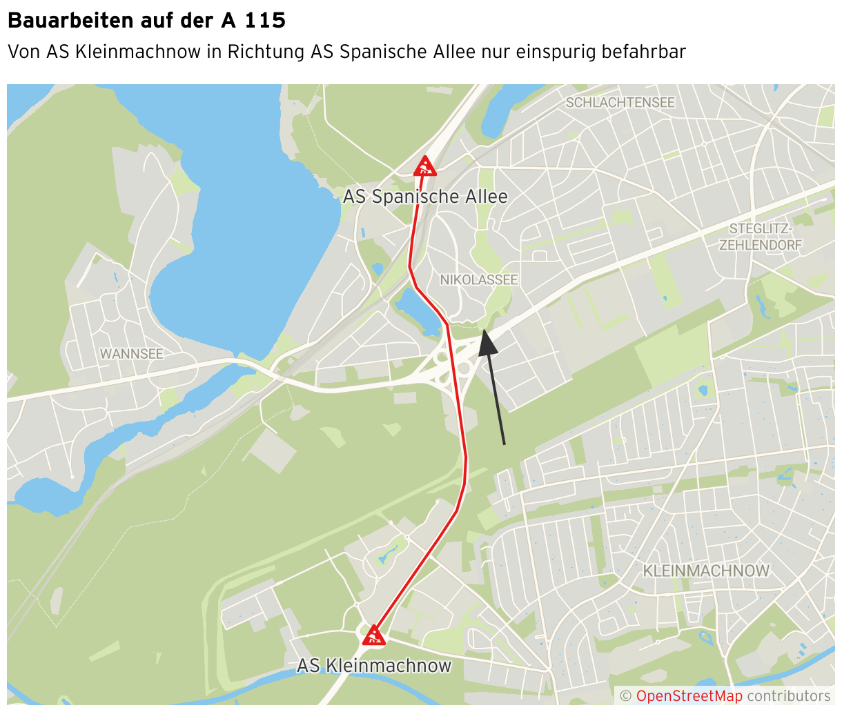 Von AS Kleinmachnow in Richtung AS Spanische Allee nur einspurig befahrbar