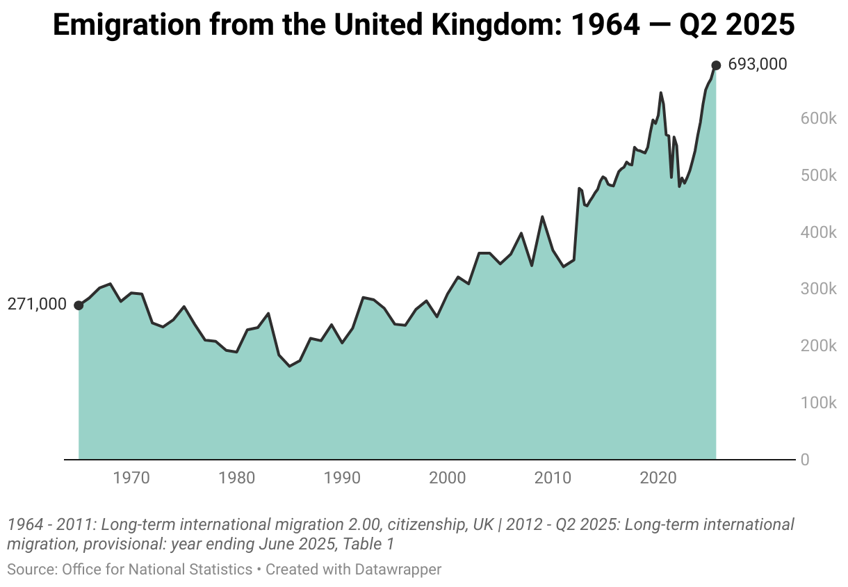 Emigration from the United Kingdom: 1964 — Q2 2025